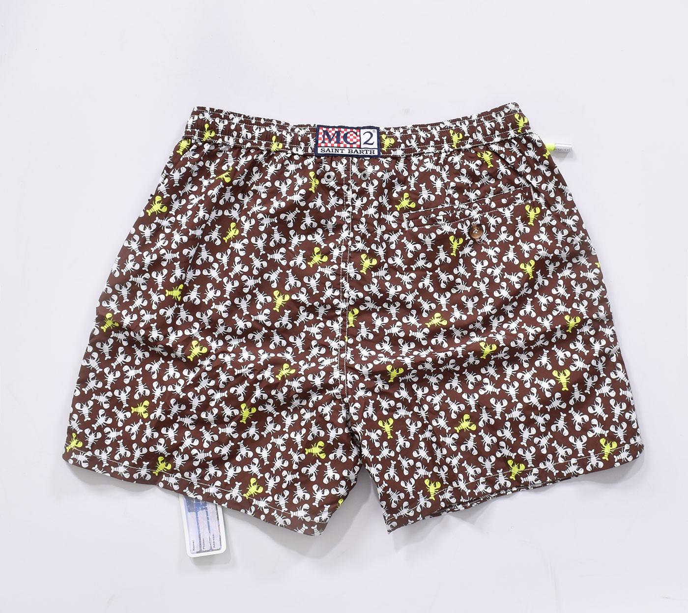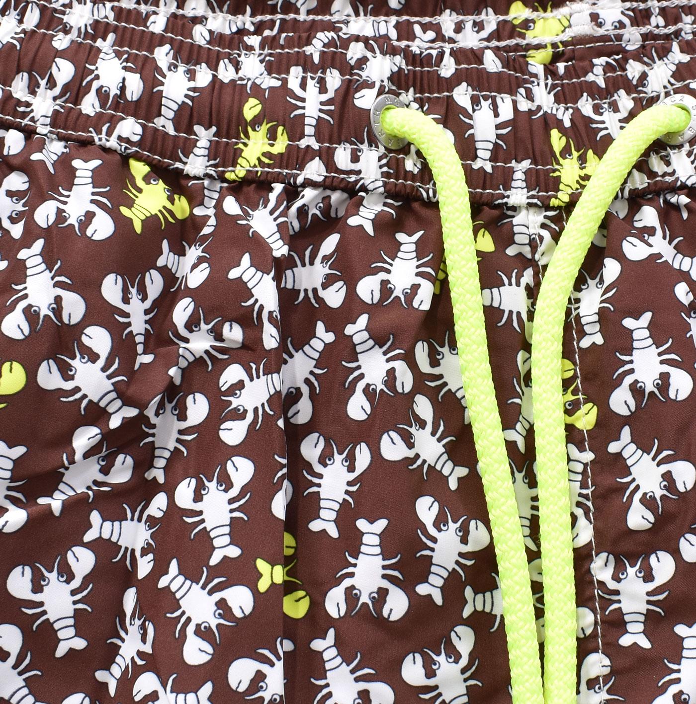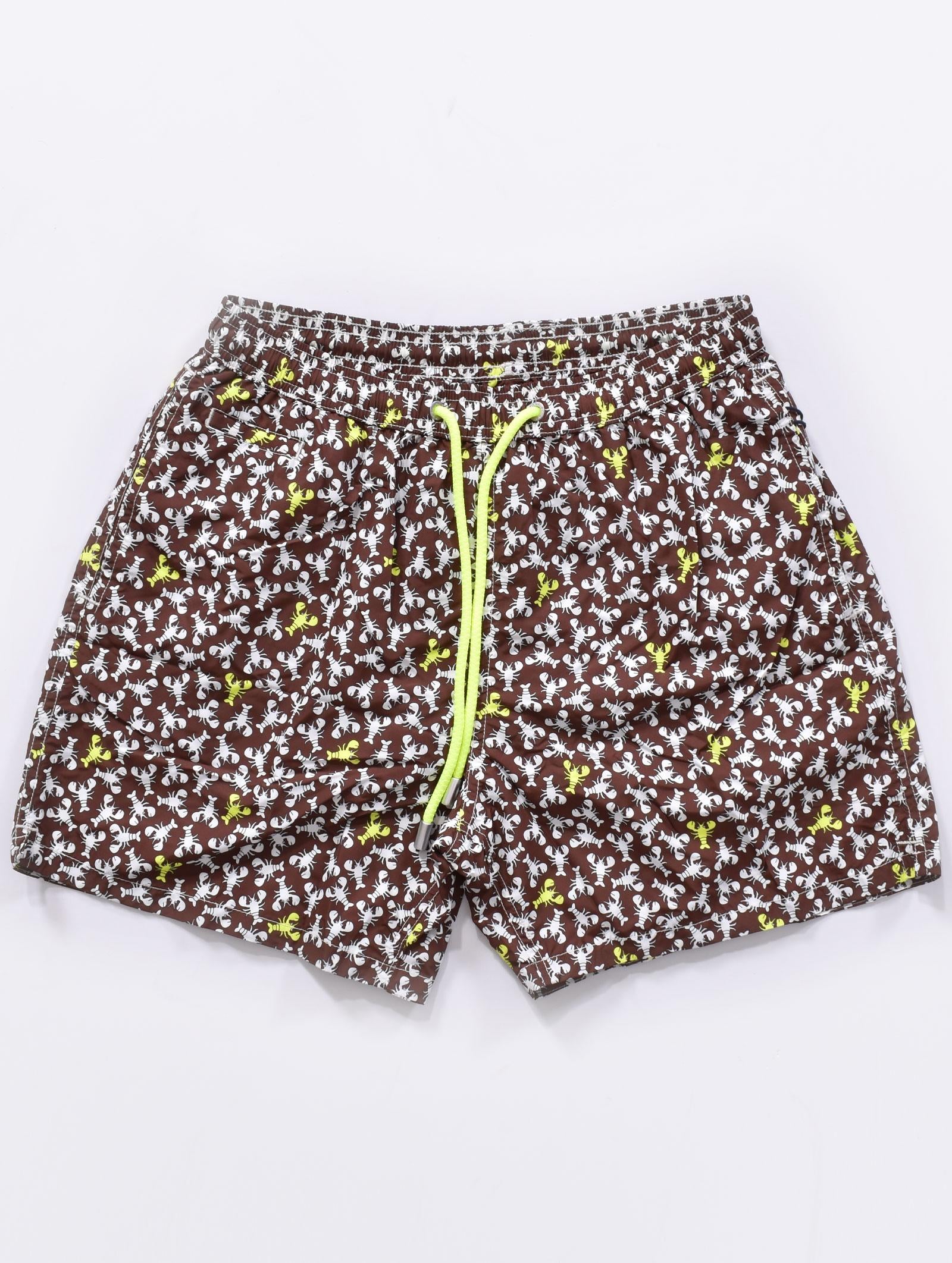 Costume da bagno modello corto, colore marrone con stampe aragoste. Elastico in vita, laccio in cotone giallo, retina antibatterica.