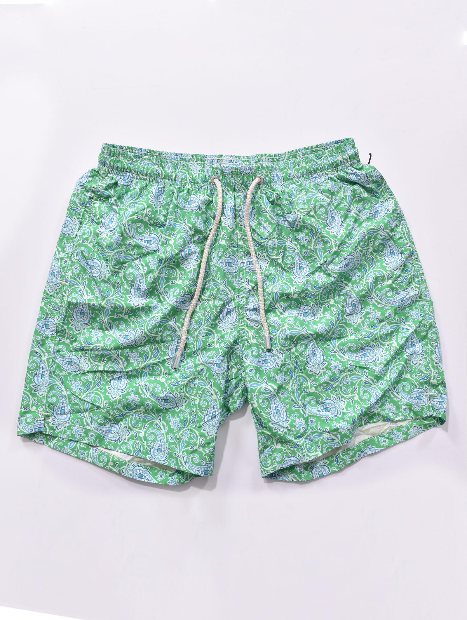 Costume da bagno modello corto, colore verde con fantasia damascata. Elastico in vita, laccio in cotone, retina antibatterica. Collezione Primavera/Estate 2024