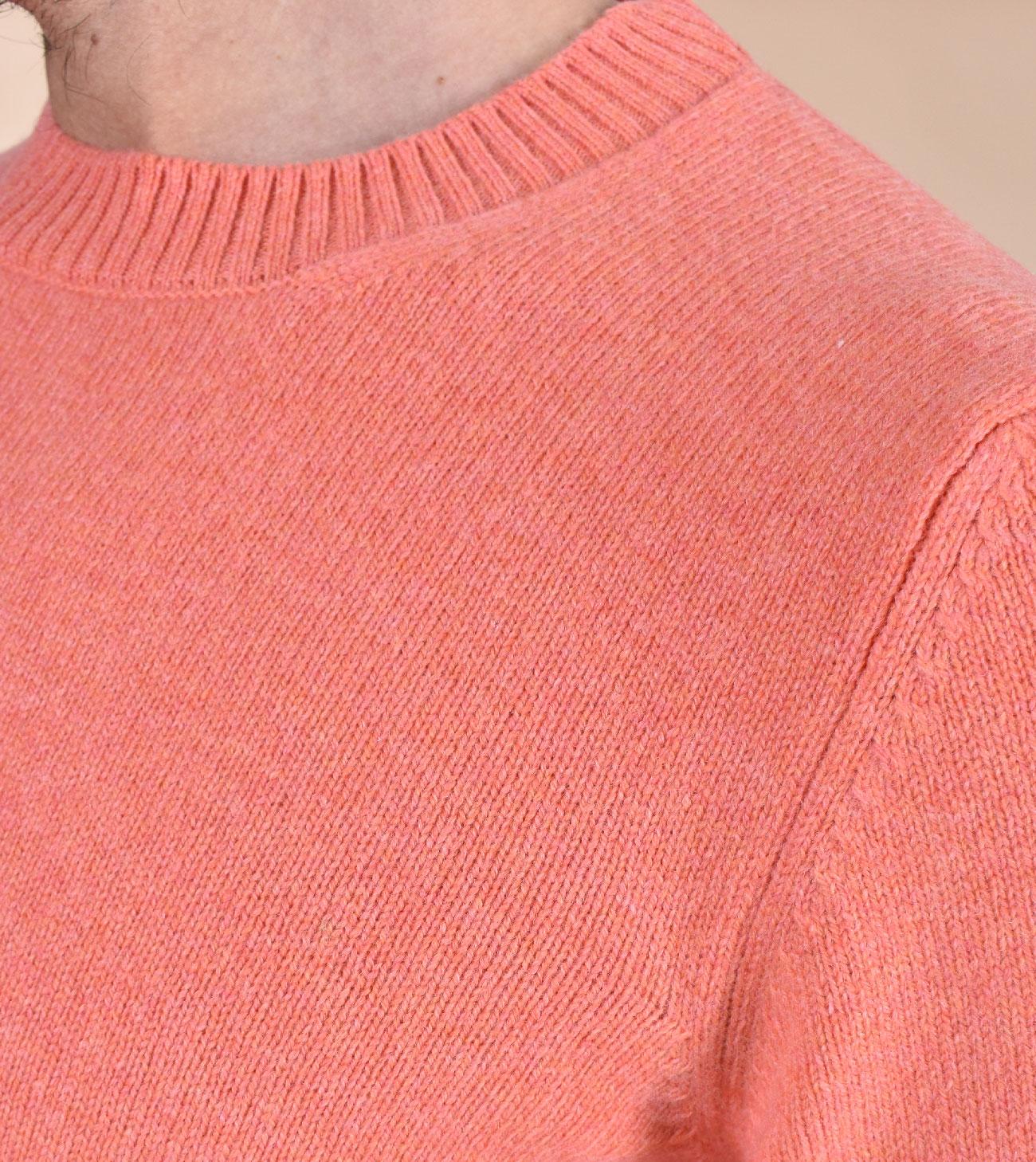 Maglia girocollo colore pesca, vestibilità regolare, lavorazione Super Geelong con strutture delle fibre più ondulate rispetto alla tradizionale lana merinos, rendendo il capo più morbido e confortevole. 100% lana vergine. Tessuto morbido e soffice, non provoca pungitura a contatto con la pelle. Made in Italy.