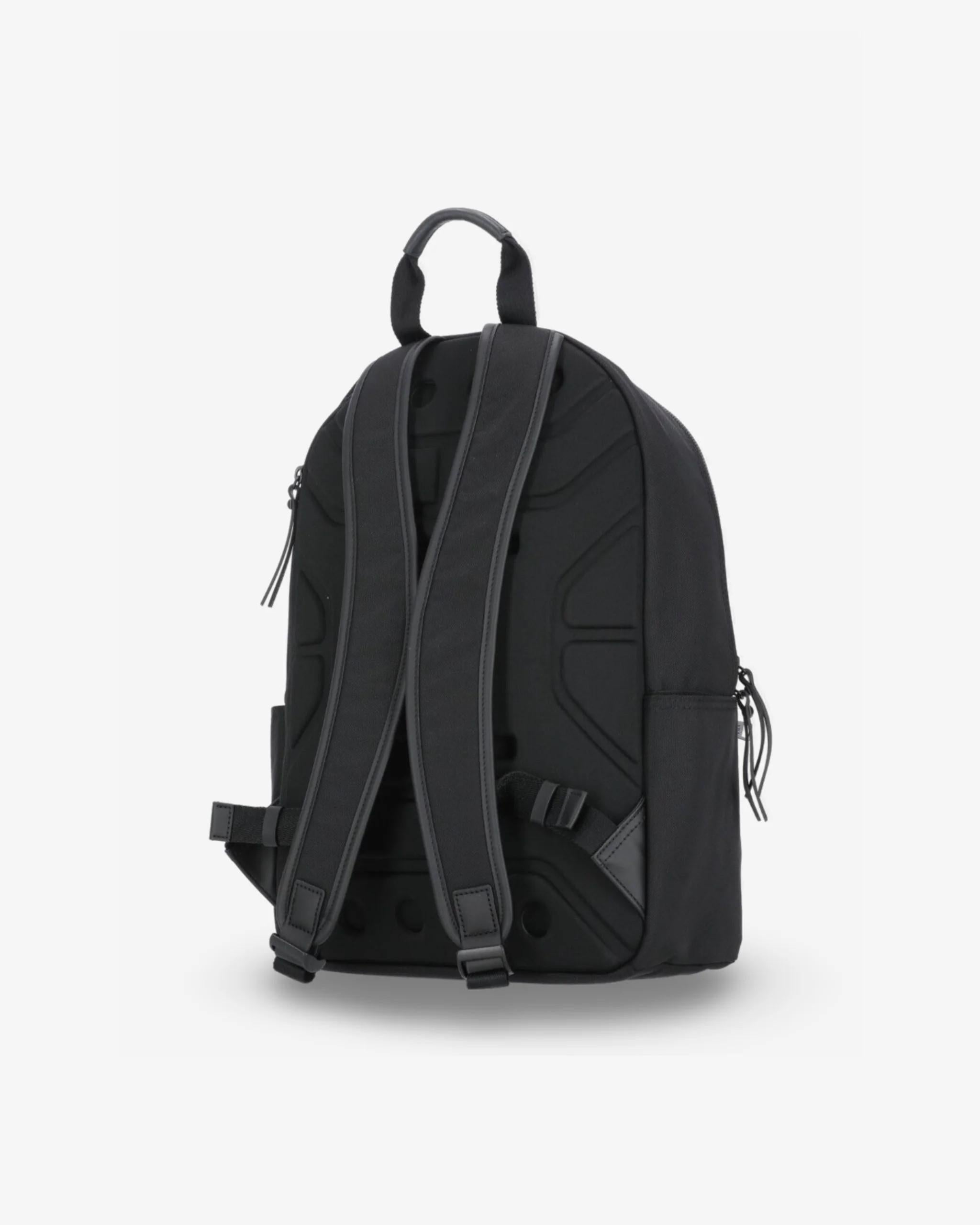 Zaino in gabardine di nylon, trattamento antisfilacciamento a prova di pioggia. Spallacci regolabili imbottiti, chiusura con cerniera in metallo a doppio cursore. Colore nero. Dimensioni: 44x30x14 cm.