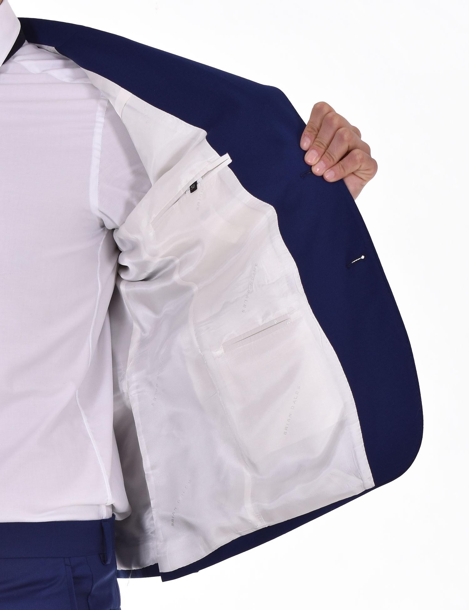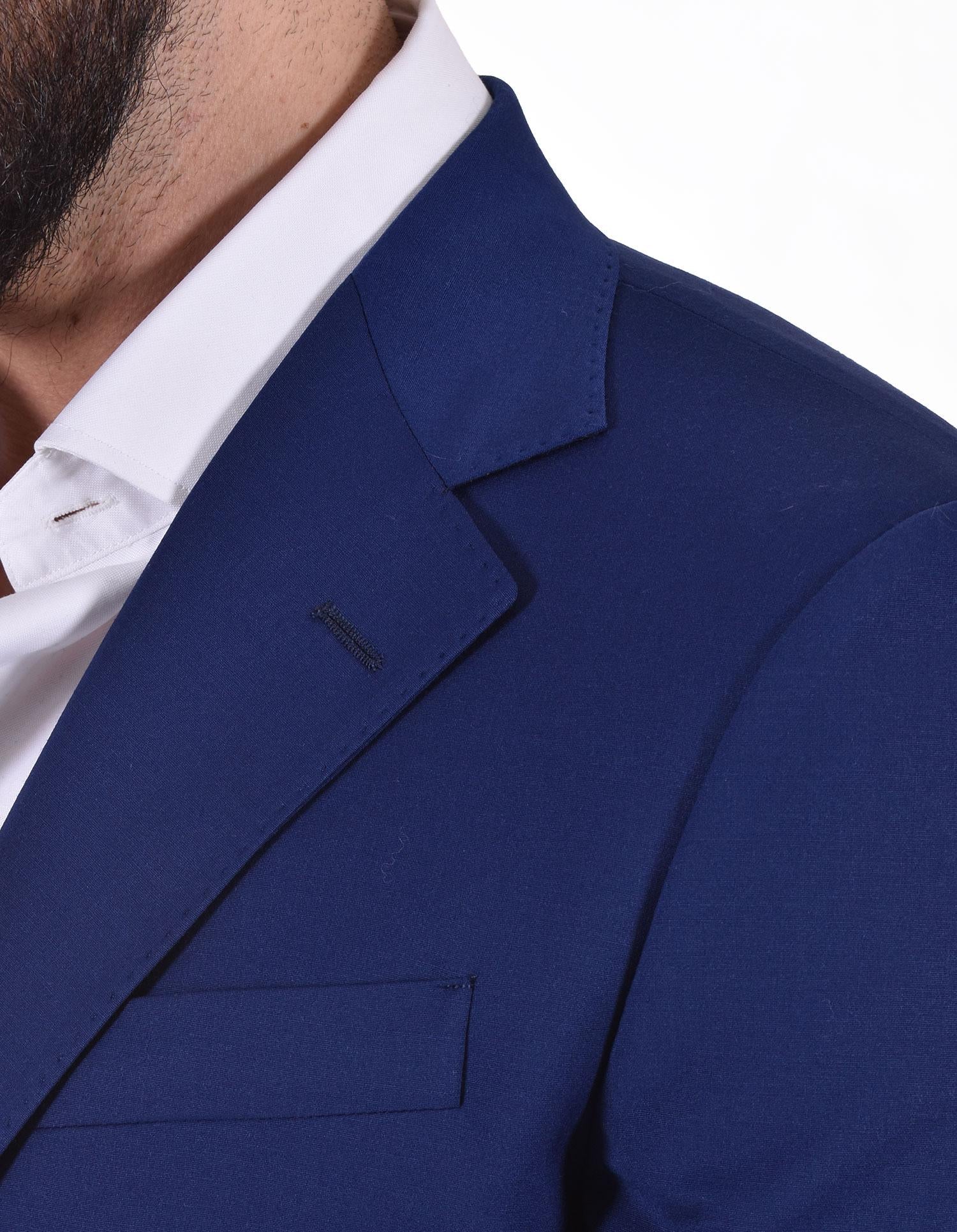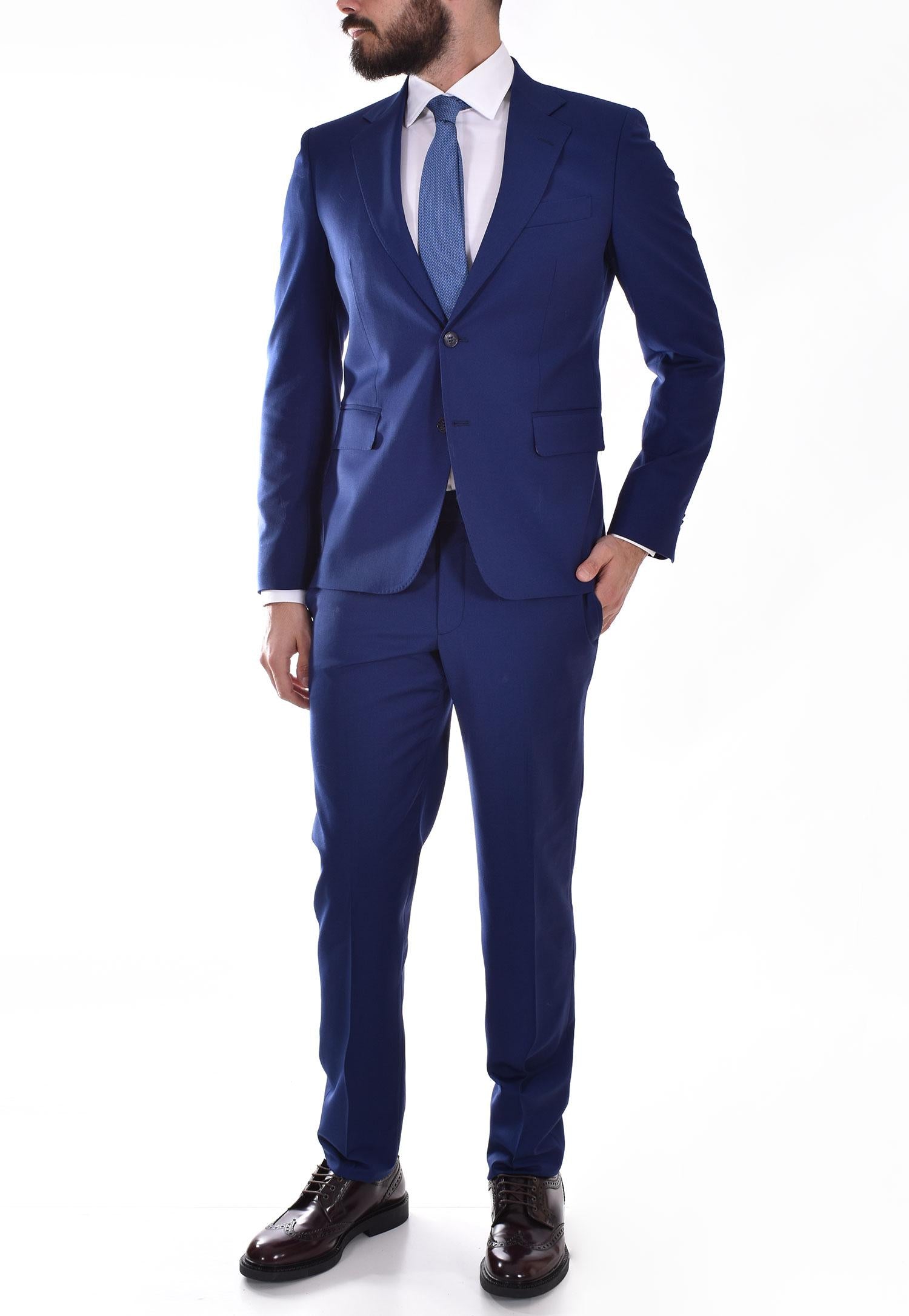 Abito colore blu chiaro con giacca a due bottoni, vestibilità slim, retro a doppio spacco. Pantalone tasca america. Composizione 74% lana, 22% lana, 4% elastan. Made in Italy.