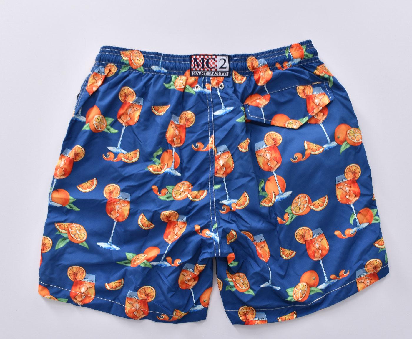 Costume da bagno colore blu con stampe drink arance. Elastico in vita, laccio in cotone, tasche ai lati, retina antibatterica.
