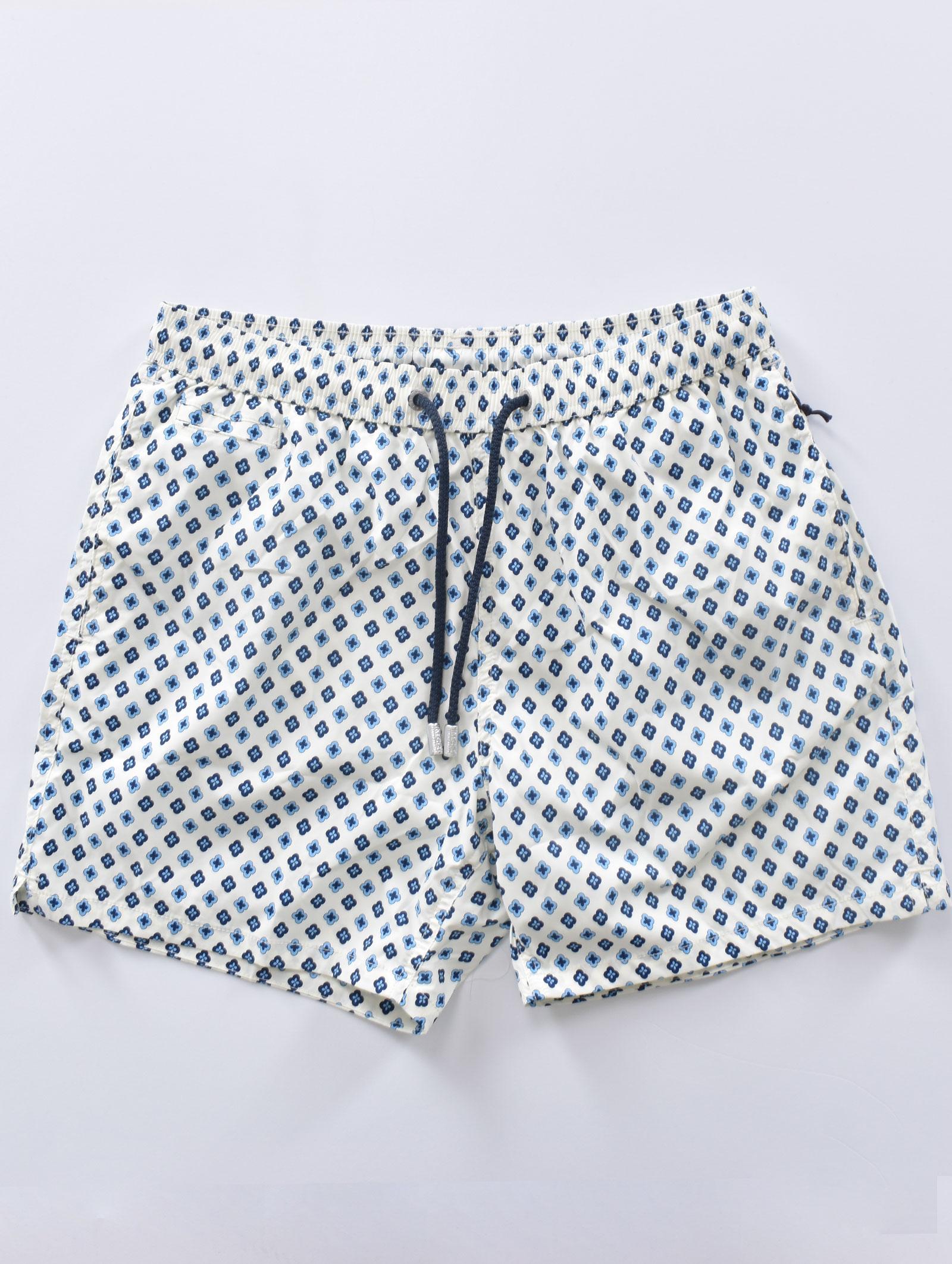 Costume da bagno colore bianco con stampe fiori geometrici blu. Elastico in vita, laccio in cotone, tasche ai lati, retina antibatterica.