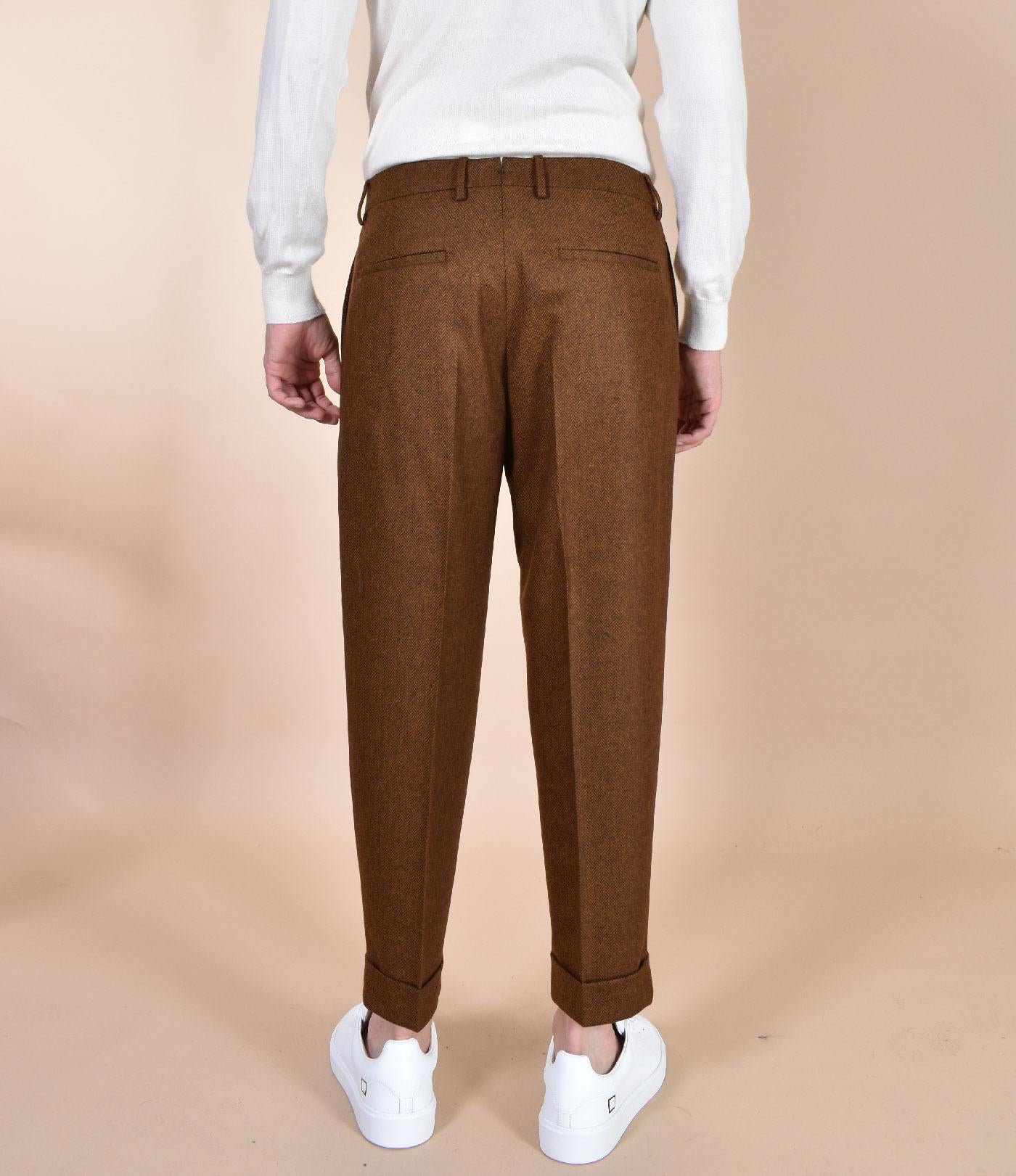 Pantalone vestibilità regolare e corta tasche america, tessuto spigato ocra. Chiusura in vita con cerniera e doppio bottone. Risvoltini cuciti sul fondo. Composizione 100% lana. Made in Italy. Collezione Autunno/Inverno 2026
