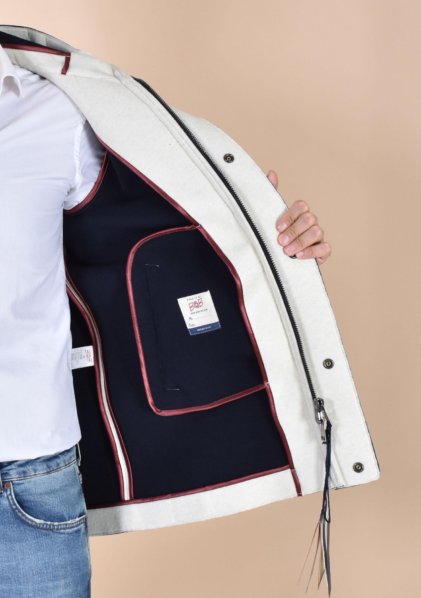 CAppotto in panno vestibilità slim, colore bianco panna, chiusura con cerniera a doppio cursore e bottoni a pressione. Tasche con patta con chiusura a bottone. Composizione 60% poliestere, 25% acrilico, 12% lana vergine. Made in Italy. Collezione Autunno/Inverno 2026 Il modello in foto è alto 1.80 x 81 kg, veste taglia 50