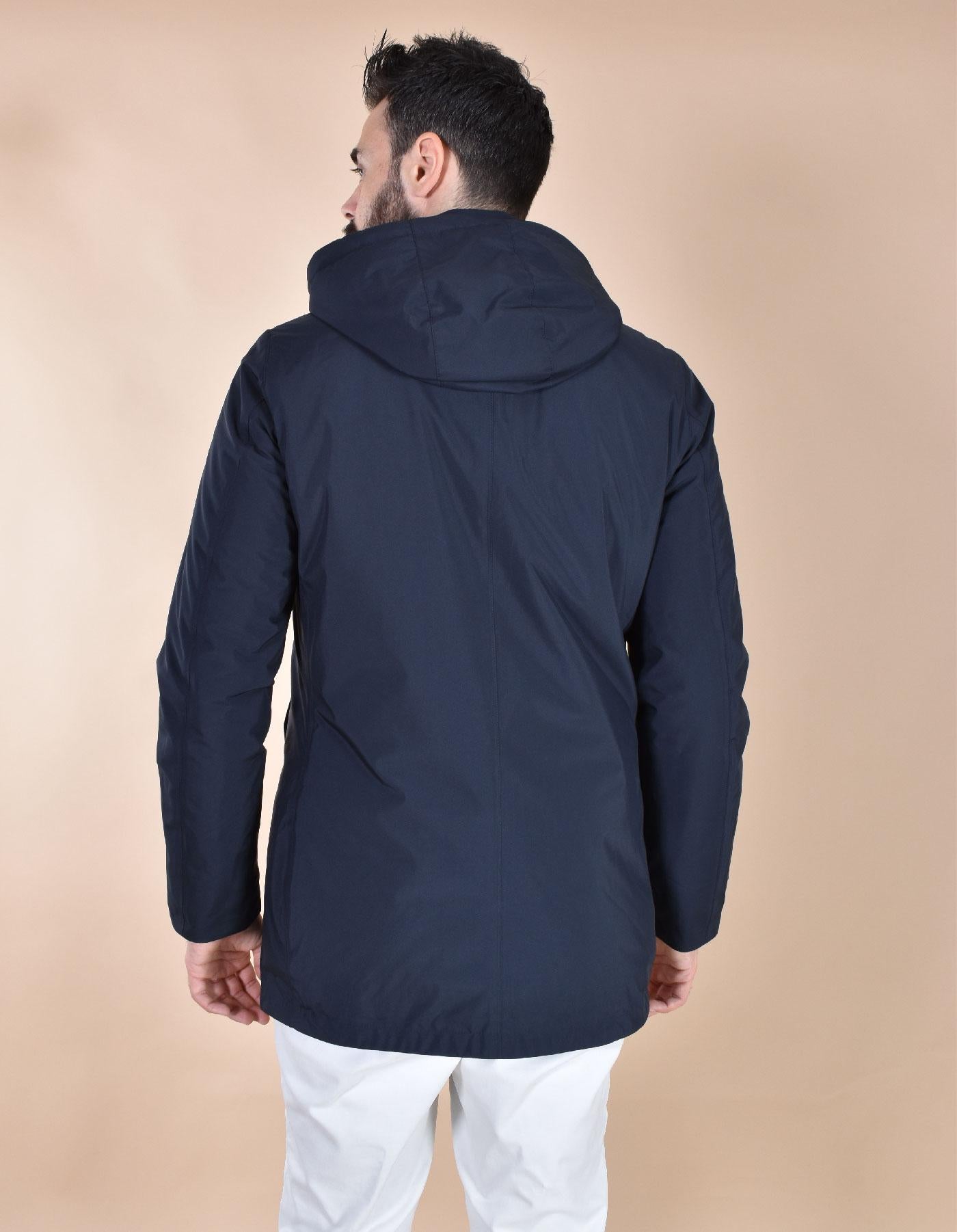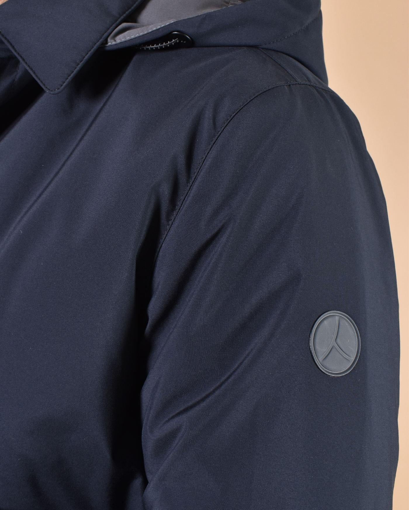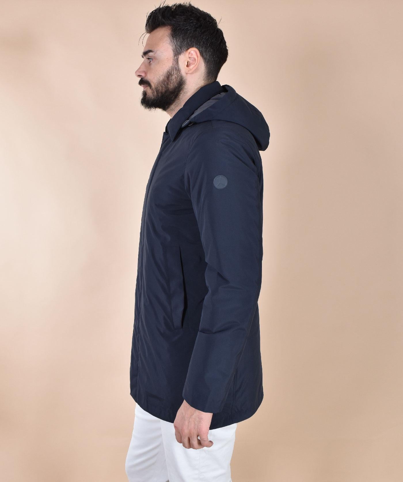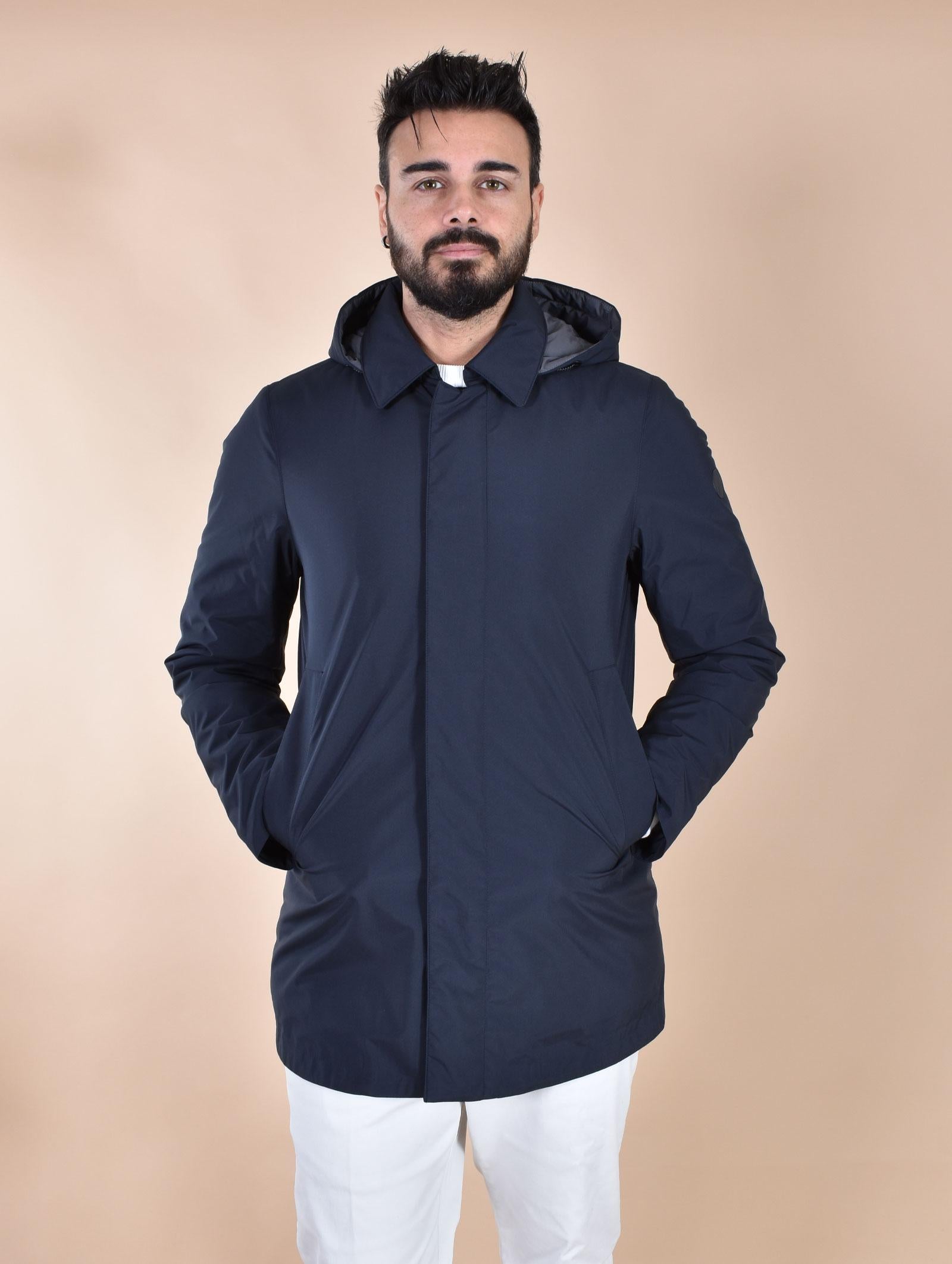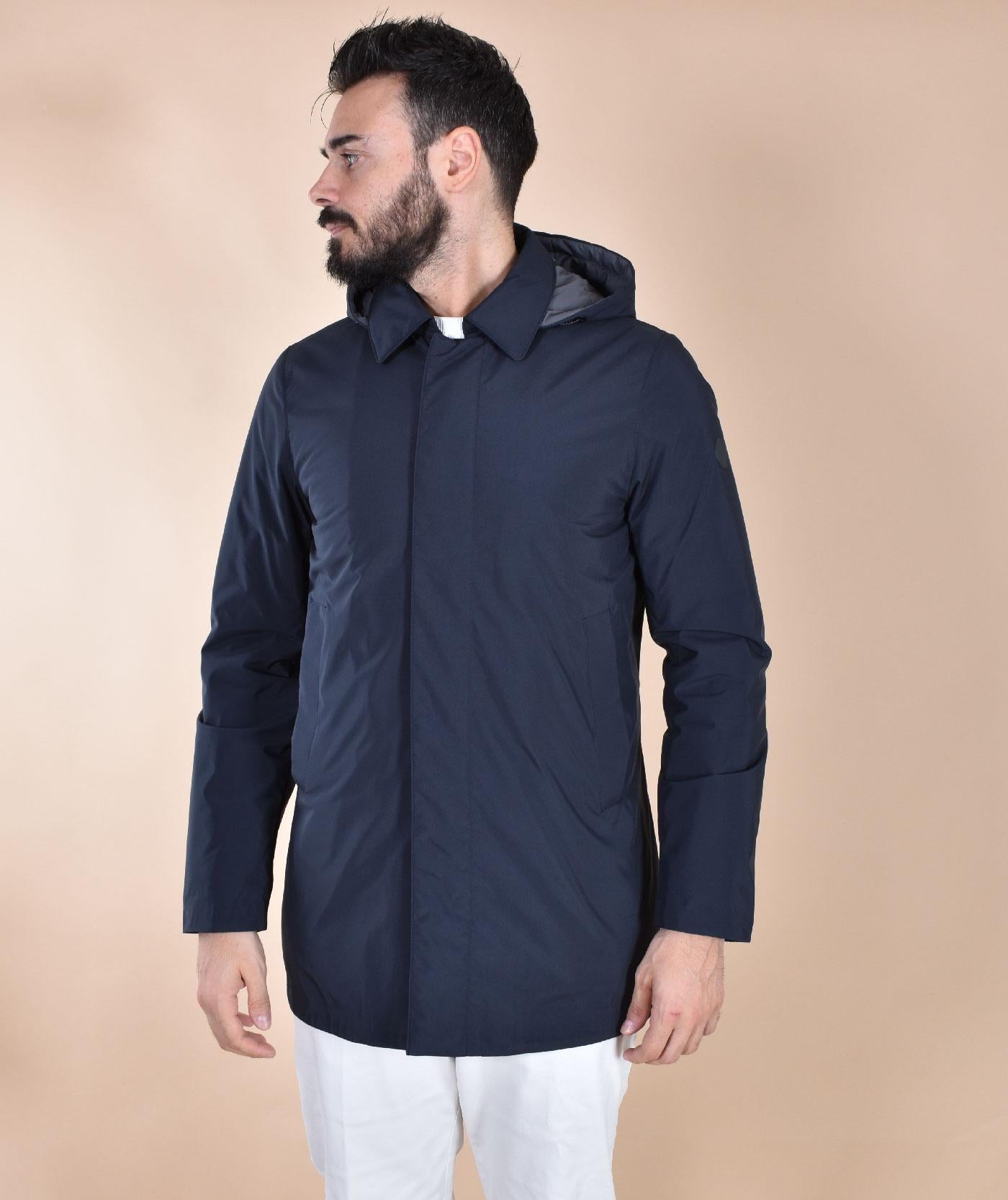 Cappotto modello spolverino trapuntato colore blu navy, in tessuto antipioggia e antivento. Cappuccio sganciabile. Chiusura con cerniera e bottoni. Tasche a filo con chiusura magnetica.