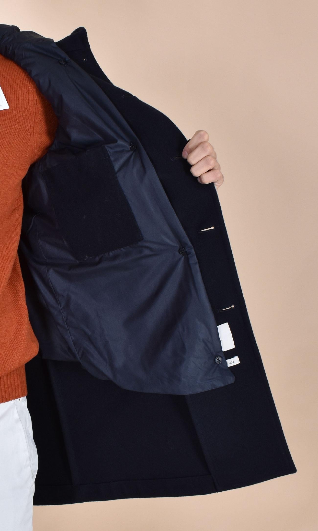Cappotto monopetto con cappuccio e trapuntina interna sganciabile. Bottoni in metallo con incisioni. Vestibilità slim.