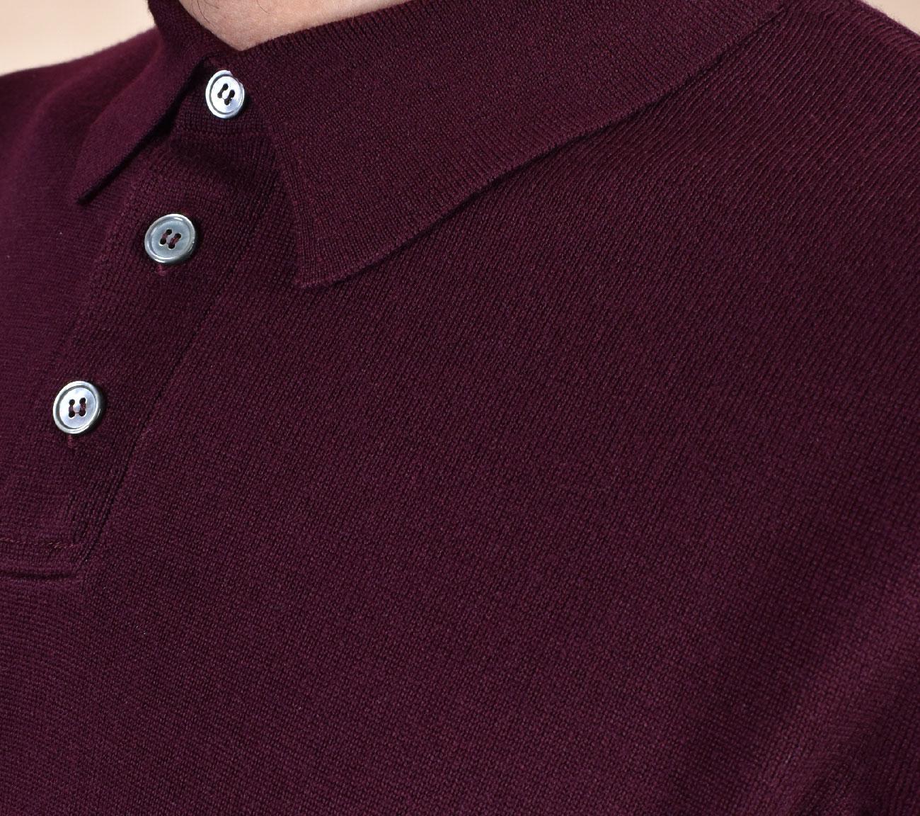 Maglia sottile modello polo con colletto a tre bottoni, tessuto rasato tinta unita color vinaccia, vestibilità slim. Tessuto morbido e soffice, non provoca fastidio al contatto con la pelle. Composizione 100% lana merino extrafine. Made in Italy.