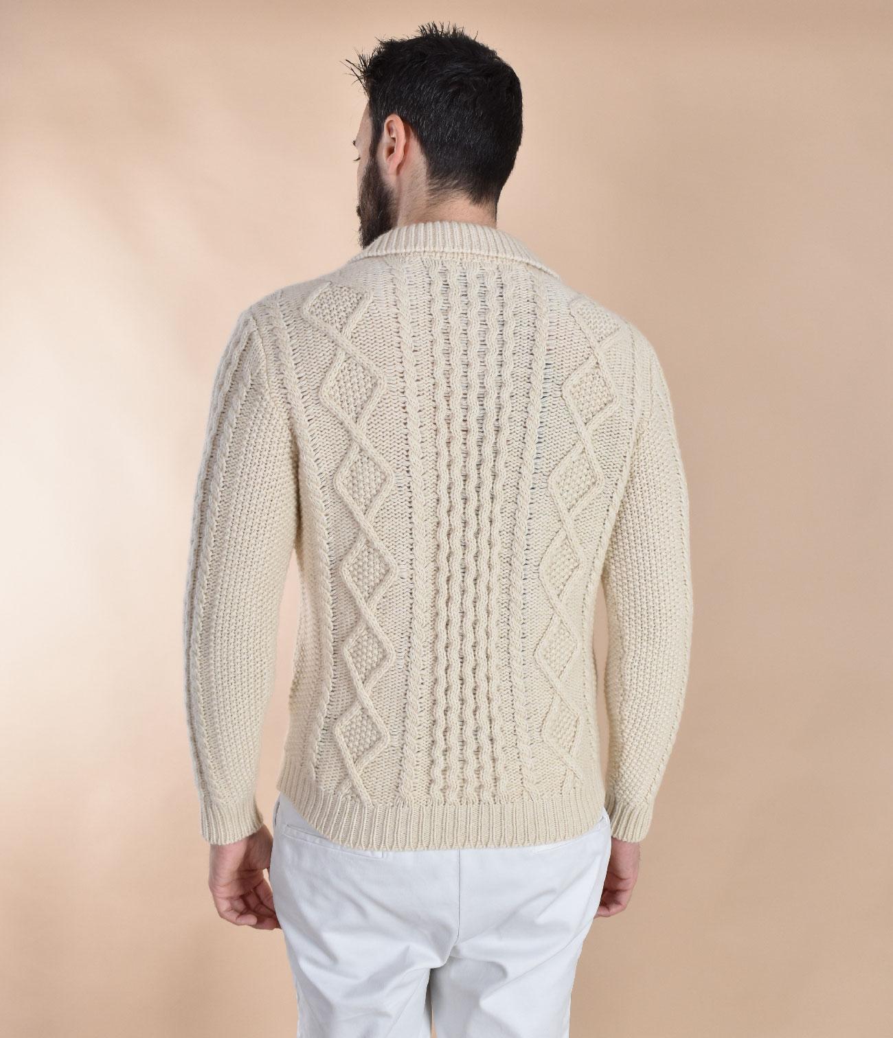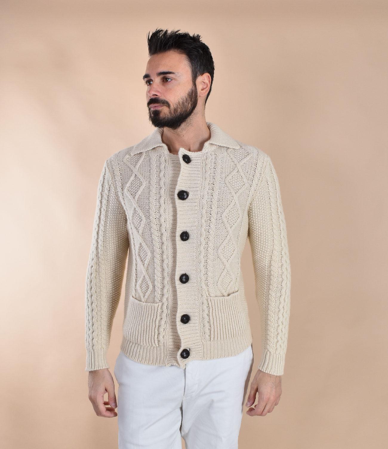 Crdigan modello camicia in lavorazione spessa, colore bianco avorio. Modello Steve McQueen (Crown). Vestibilità slim. Tessuto morbido e soffice, non provoca fastidio a contatto con la pelle. Composizione 100% lana baby merino extrafine. Made in Italy.