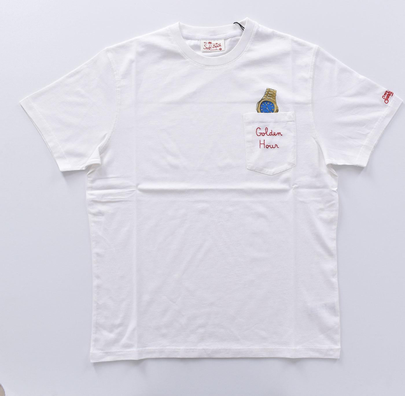 T-shirt vestibilità regolare, colore bianco con stampa orologio e scritta ricamata colorata su taschino.