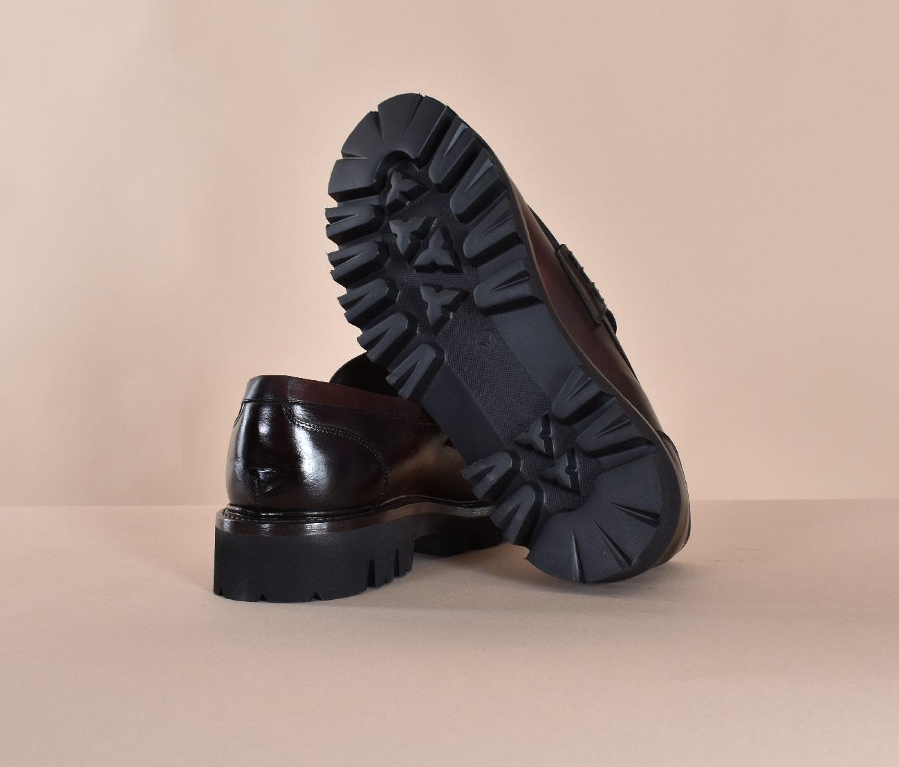 Scarpe artigianali fatte a mano modello mocassini alti, in vera pelle colore testa di moro. Suola in gomma leggera. Made in Italy. Collezione AUtunno/Inverno 2026