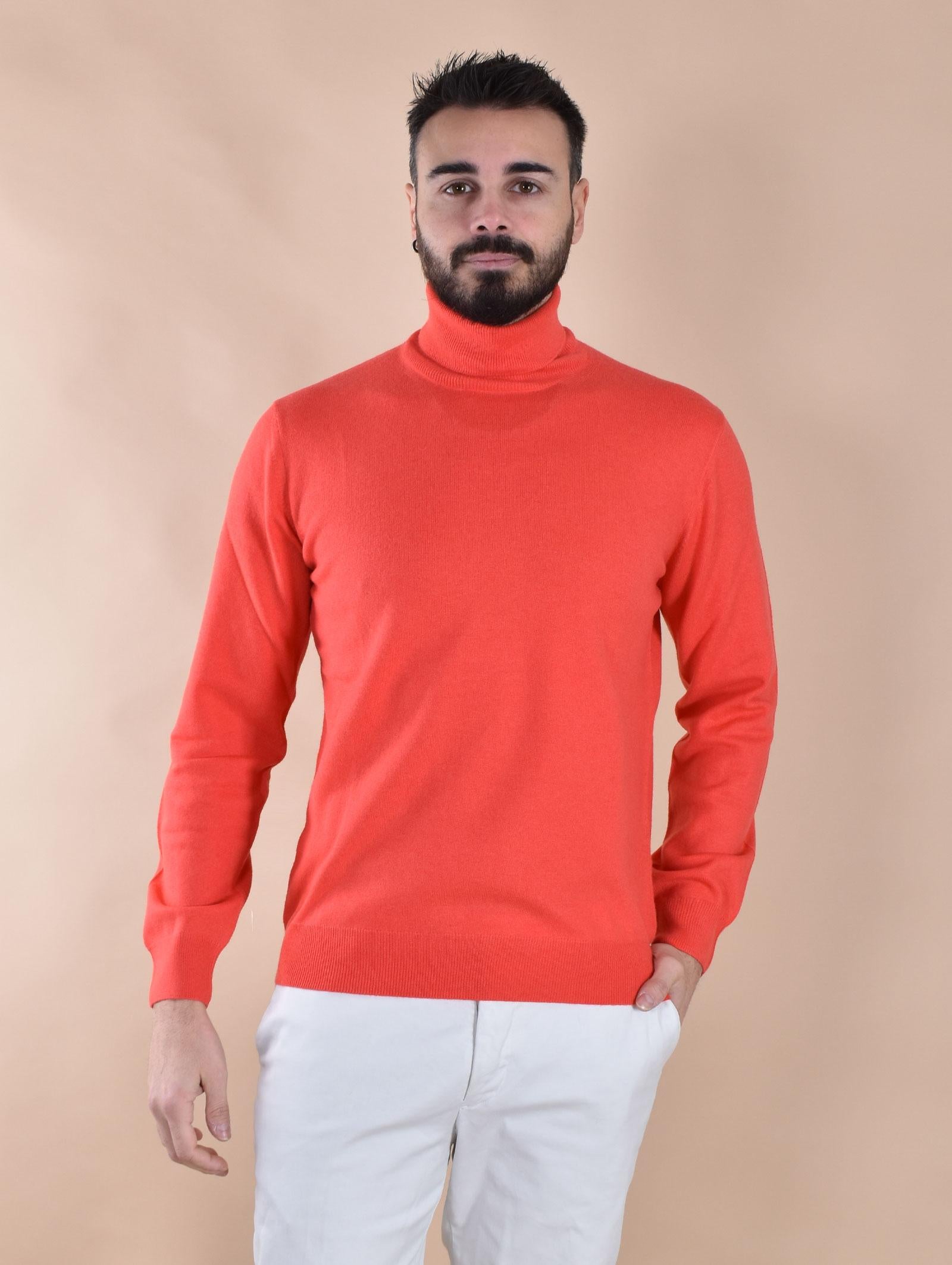 Maglia rasata modello dolcevita, vestibilità regolare, colore corallo. Composizione 80% lana merino extrafine, 20% cashmere. Tessuto morbido e soffice, non provoca fastidio a contatto con la pelle. Made in Italy. Collezione Autunno/Inverno 2026 Il modello in foto veste taglia 50, è alto 1.81cm e pesa circa 81 kg