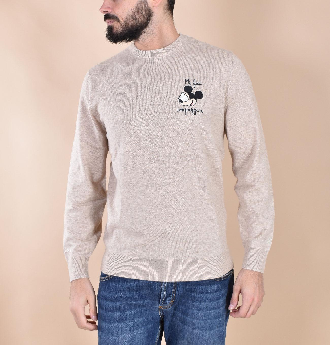 Maglia girocollo vestibilità slim, colore beige con scritta ricamata Mickey mouse. Edizione DIsney Tessuto morbido e soffice, non provoca fastidio a contatto con la pelle. Composizione 40% lana, 25% viscosa, 10% cashmere, 25% poliammidica.