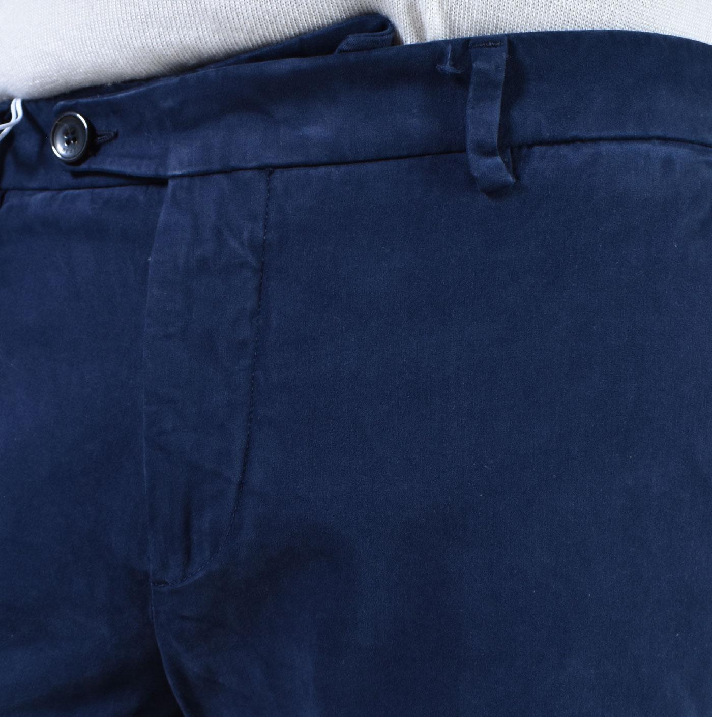 Pantalone vestibilità slim e corta, in tessuto vellutato, colore blu notte. Tasche america, chiusura in vita con cerniera e doppio bottone. Composizione 96% cotone, 4% elastan. Made in Italy. Collezione Autunno/Inverno 2026