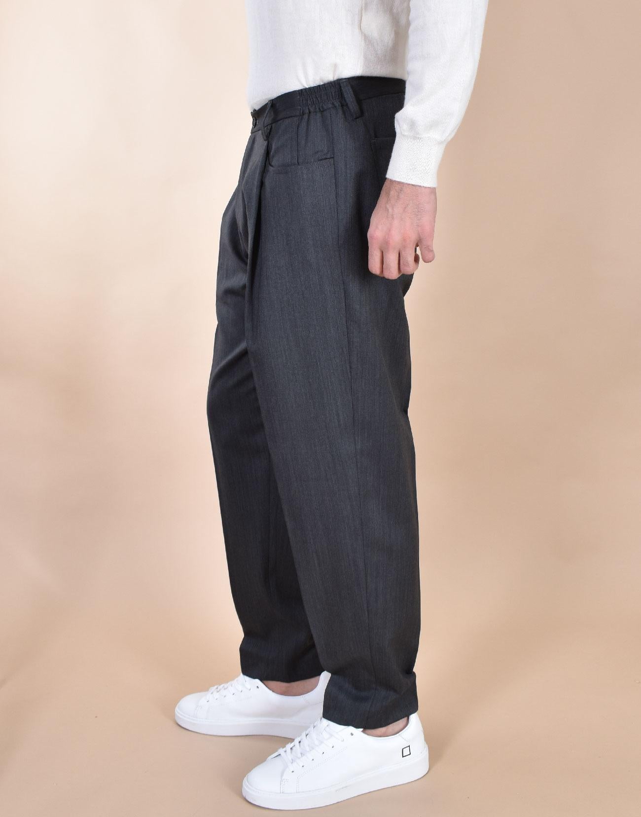 Pantalone tasche america con pinces, vestibilità regolare e corta, colore grigio antracite. Chiusura in vita con cerniera e bottone. Composizione 100% lana vergine. Made in Italy. Collezione Autunno/Inverno 2026 Il modello in foto è alto 1.80 x 81 kg, veste taglia 34