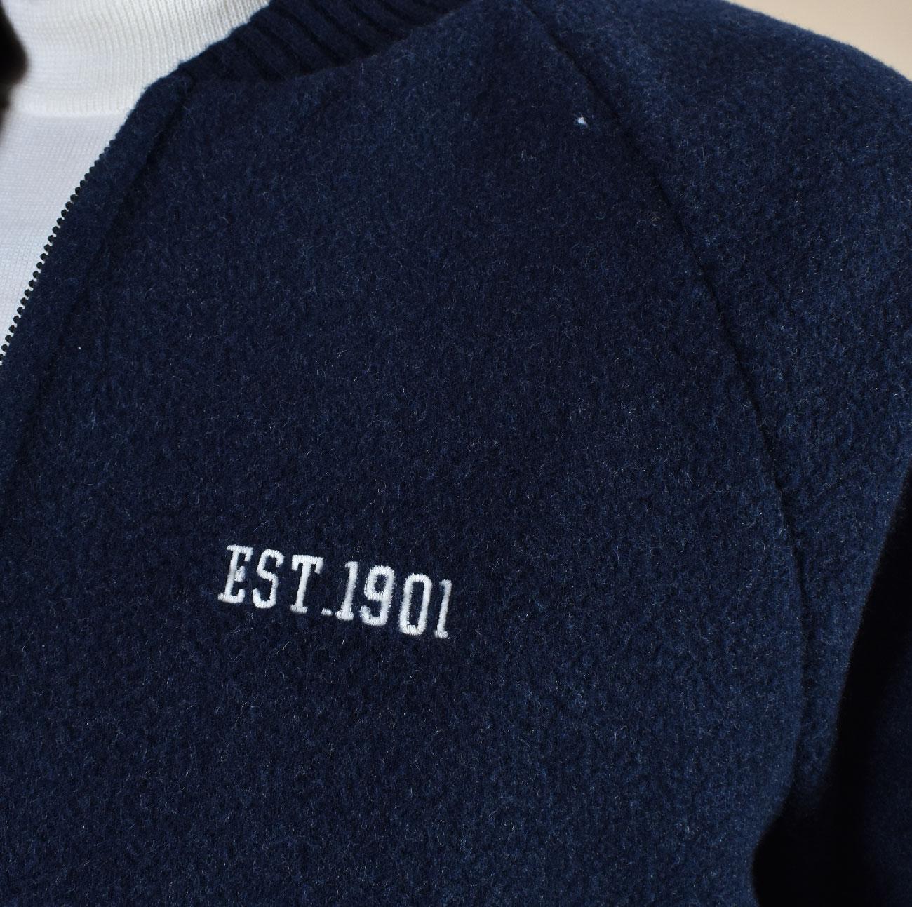 Bomber modello college in lana colore blu, vestibilità slim. Composizione 90% lana, 10% cashmere. Patch con scritta Humans sul retro. Made in Italy. Collezione Autunno/Inverno 2026 Il modello in foto è alto 1.80 x 81 kg, veste taglia L