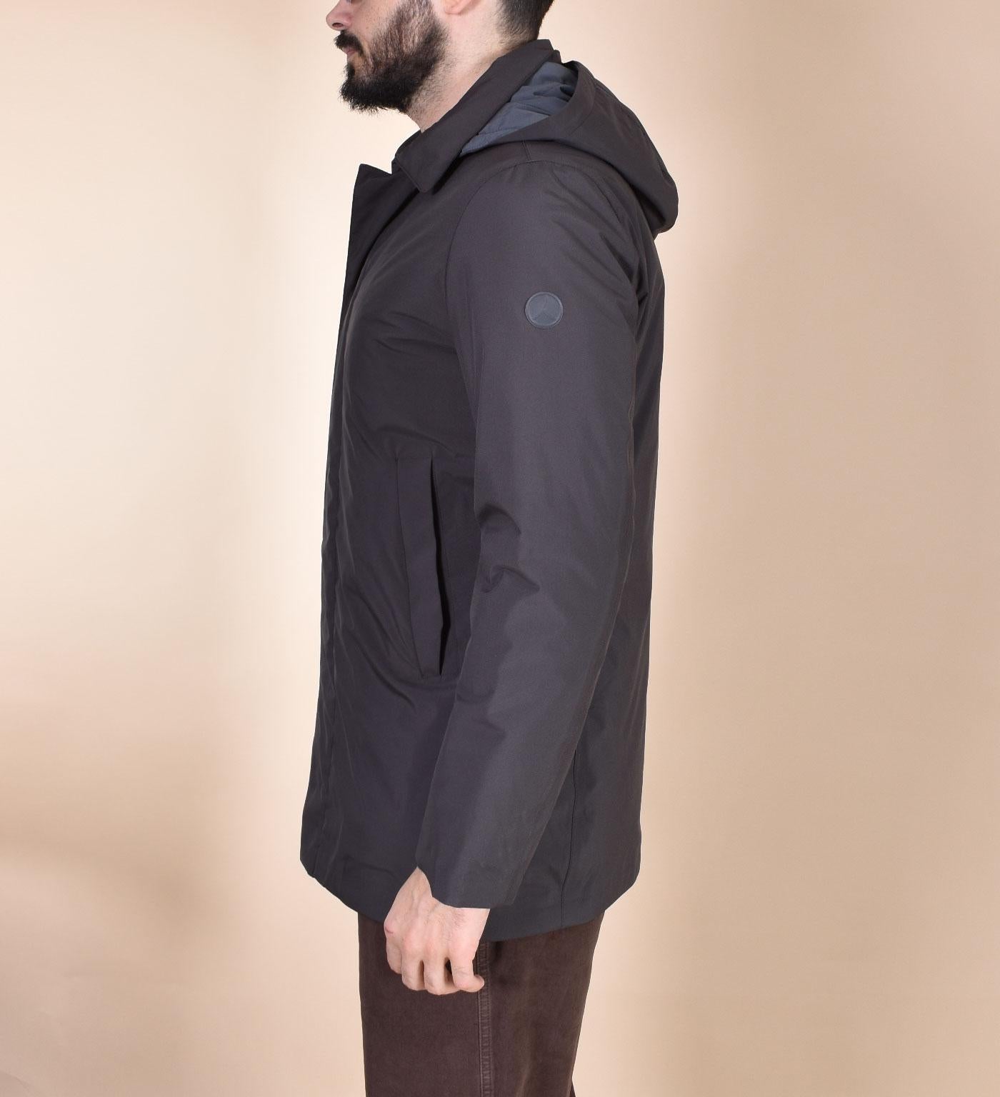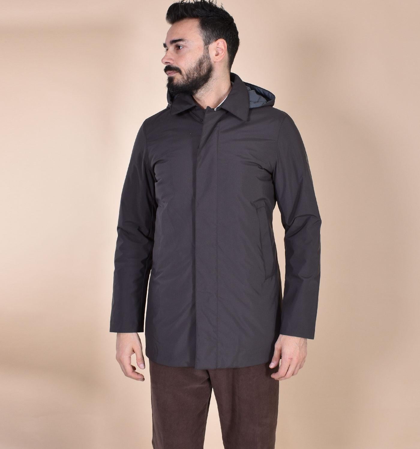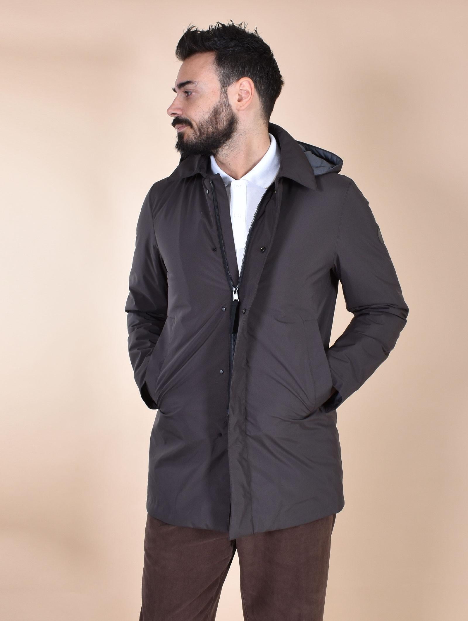 Cappotto modello spolverino trapuntato colore marrone, in tessuto antipioggia e antivento. Cappuccio sganciabile. Chiusura con cerniera e bottoni. Tasche a filo con chiusura magnetica. Collezione Autunno/Inverno 2026 Il modello in foto è alto 1.80 x 81 kg, veste taglia 50