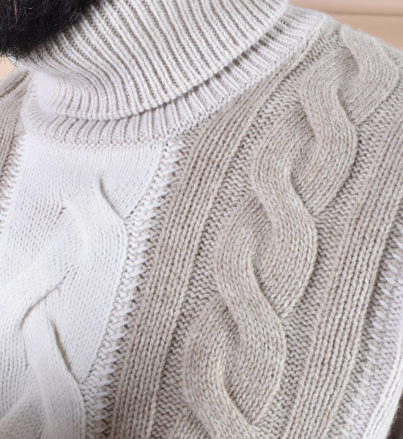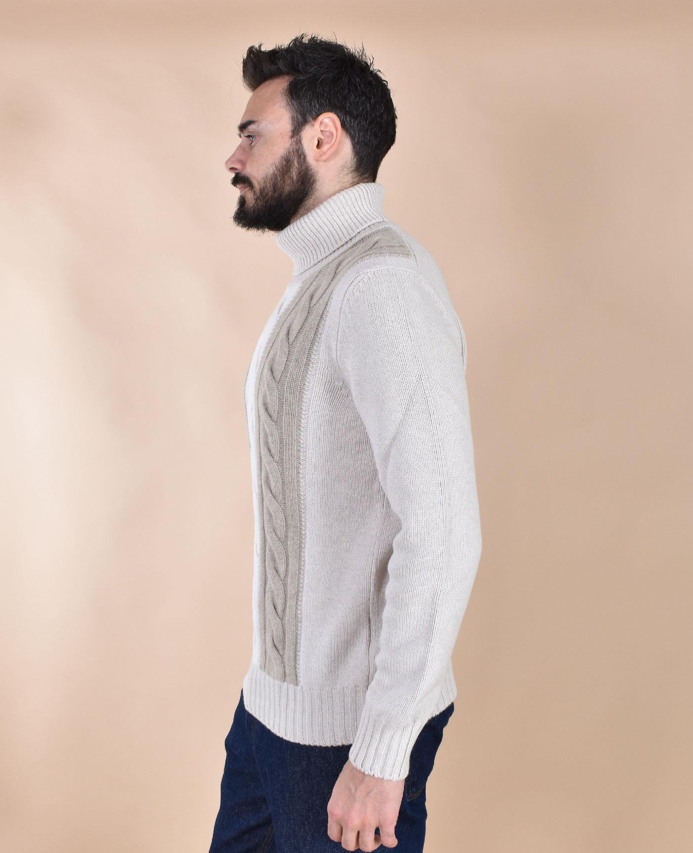 Maglione dolcevita slim fit in 100% lana vergine ultra soffice, lavorazione Super Geelong. Tessuto morbido e soffice, non provoca pungitura a contatto con la pelle. Colore bianco con contrasti beige, lavorazione a traccia. Made in Italy. Collezione Autunno/Inverno 2026