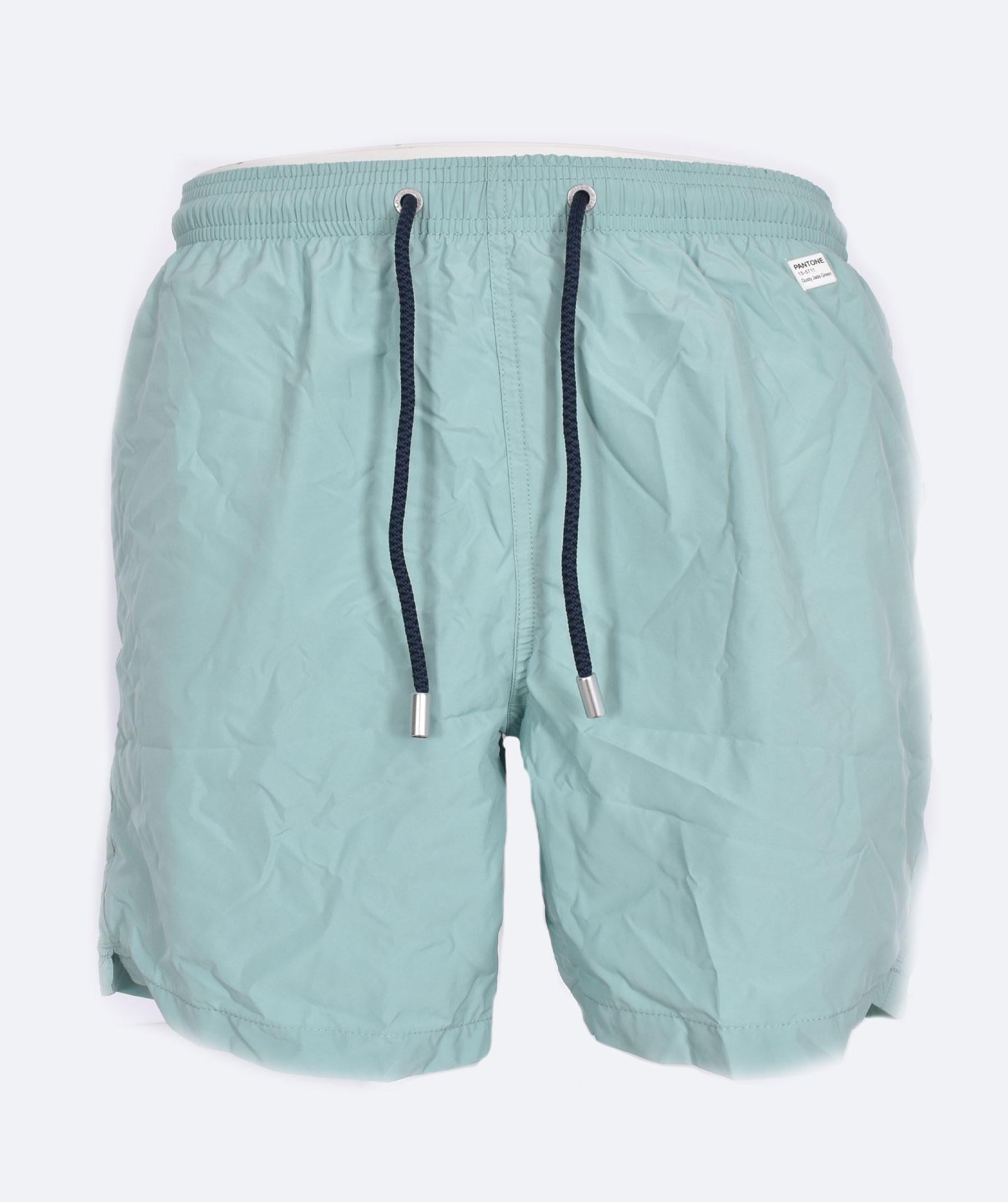 Costume da bagno modello corto, colore verde acqua tinta unita. Elastico in vita, laccio in cotone, tasche ai lati, retina antibatterica. Collezione Primavera/Estate 2025