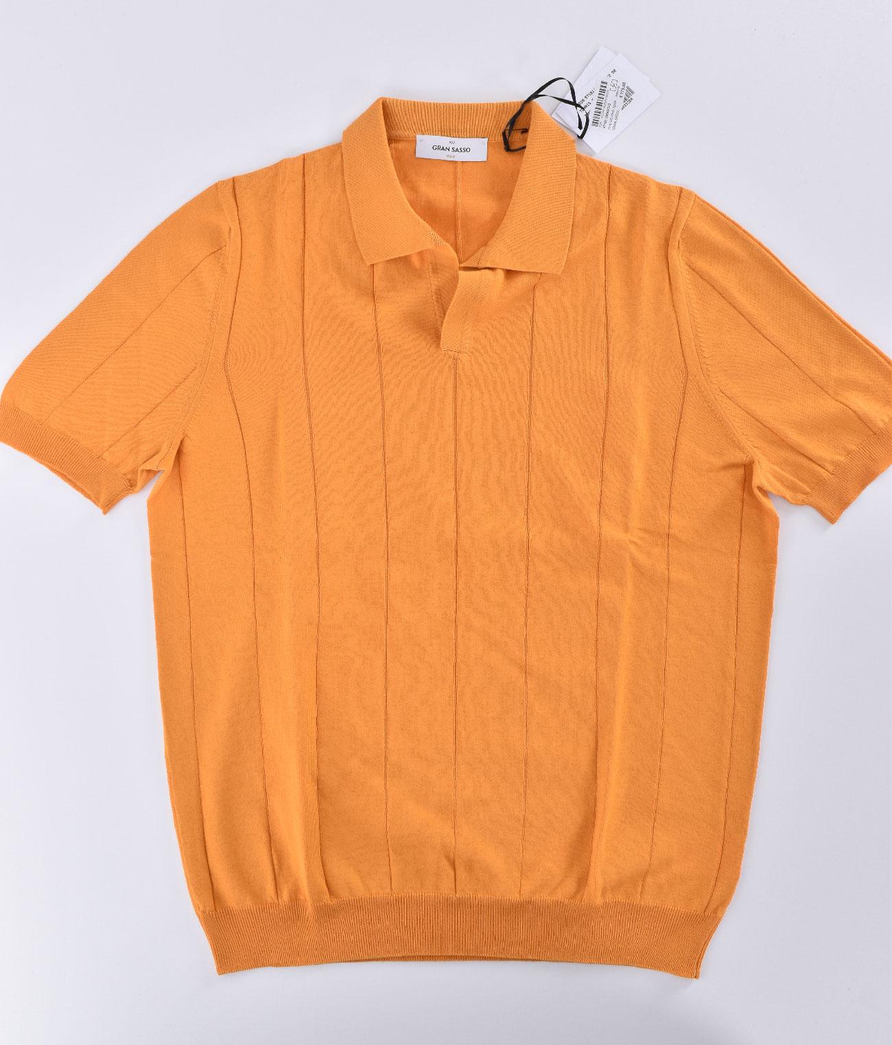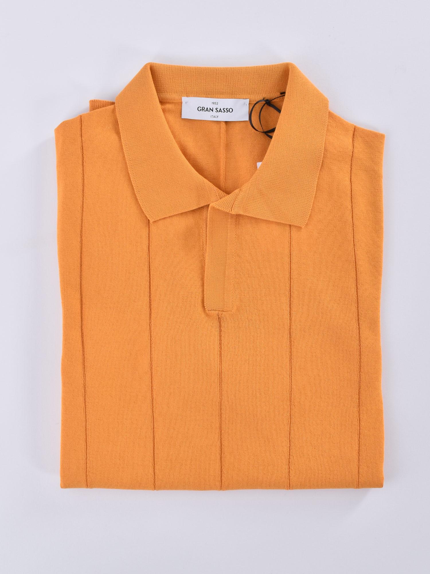 Polo in tessuto a maglia lavorazione fresh cotton, cotone Egitto compatto crèpe zero pilling, morbide e fresche al tatto vestibilità slim. Colore arancio con lavorazioni a righe verticali. Colletto a V. Composizione 100% cotone. Made in Italy. Collezione Primavera/Estate 2026