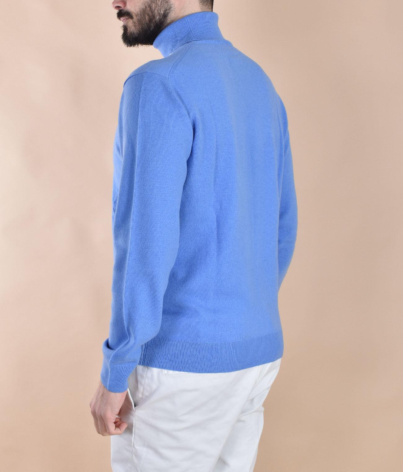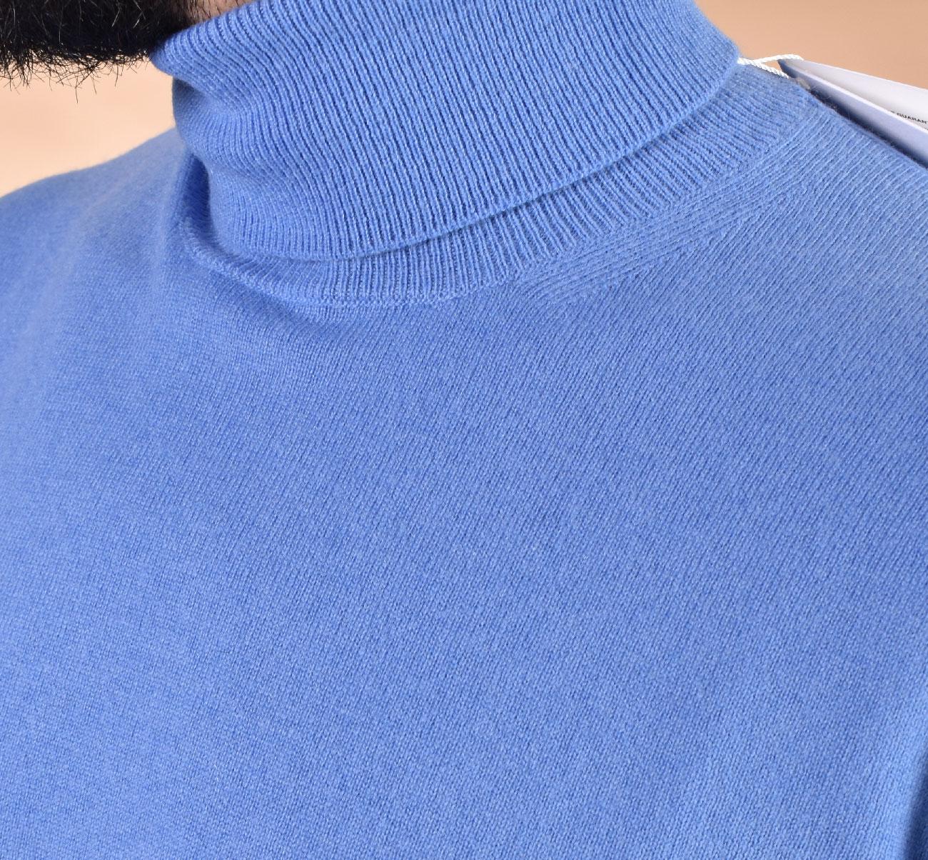 Maglia rasata modello dolcevita, vestibilità regolare, colore oceano. Composizione 80% lana merino extrafine, 20% cashmere. Tessuto morbido e soffice, non provoca fastidio a contatto con la pelle. Made in Italy.