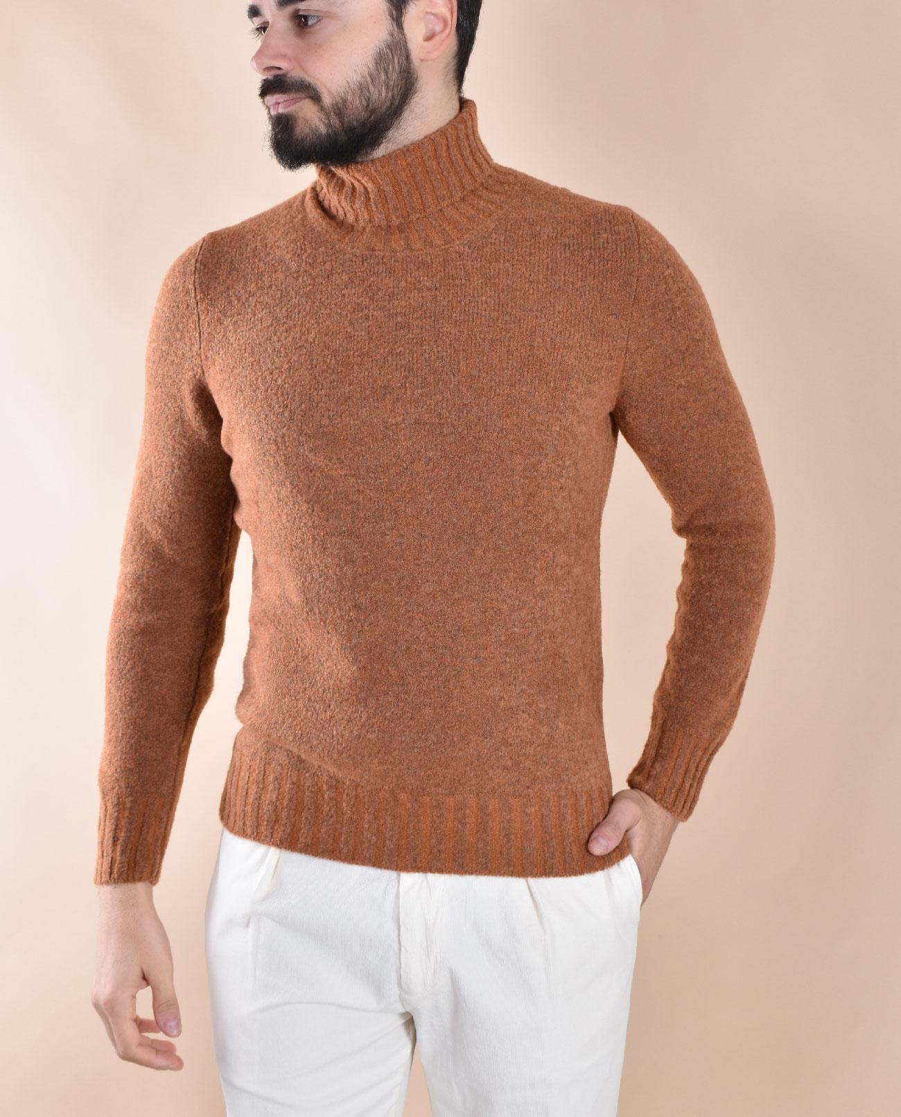 Maglione collo alto modello dolcevita, in lana soft, leggera, calda e morbida al tatto, colore ruggine. Vestibilità slim. Composizione 70% lana vergine, 30% poliammide. Made in Italy.