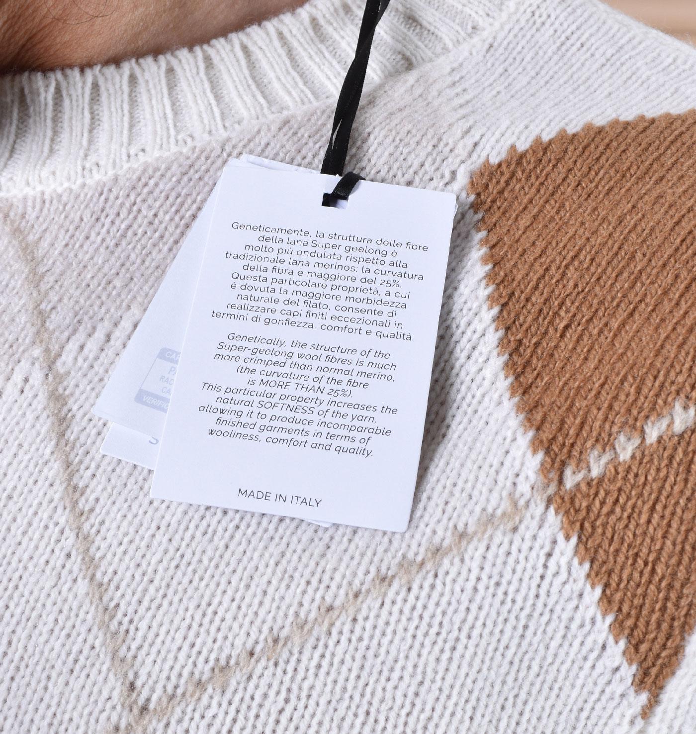 Maglia girocollo slim fit in 100% lana vergine ultra soffice, lavorazione Super Geelong. Tessuto morbido e soffice, non provoca pungitura a contatto con la pelle. Colore bianco con fantasia rombi. Made in Italy. Collezione Autunno/Inverno 2026 Il modello in foto è alto 1.80 x 81 kg, veste taglia 50