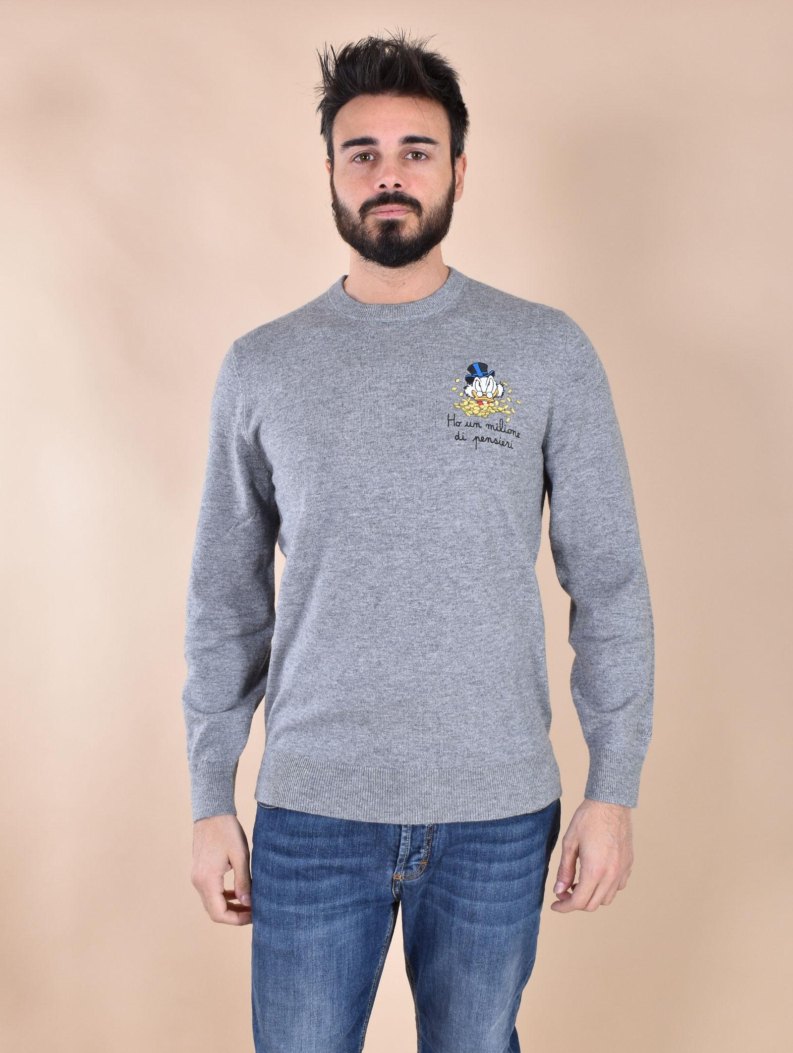 Maglia girocollo vestibilità regolare, colore grigio con stampa ricamata zio paperone. Tessuto morbido e soffice, non provoca pungitura a contatto con la pelle. Composizione 40 % lana, 25% viscosa, 25% poliammide, 10% cashmere.