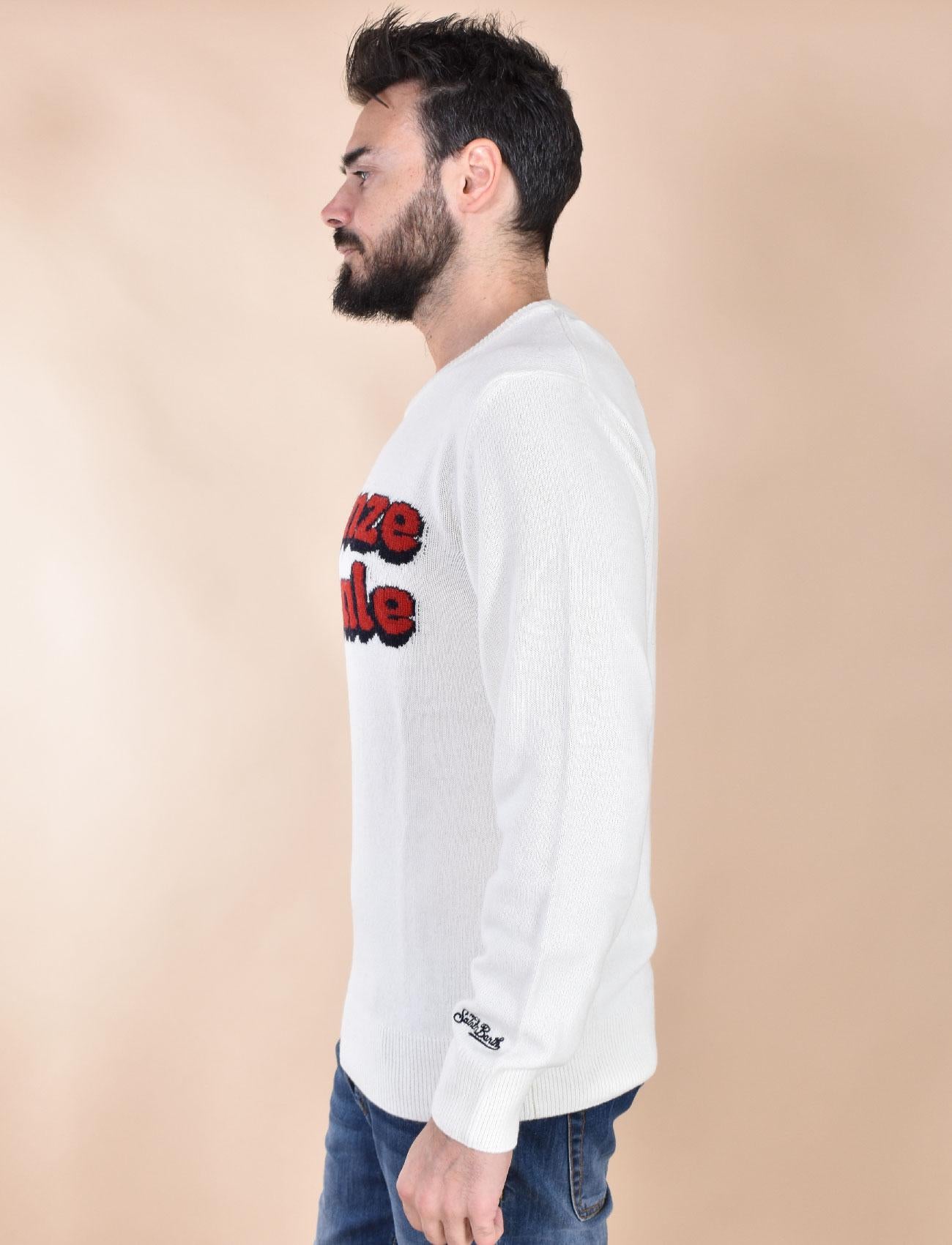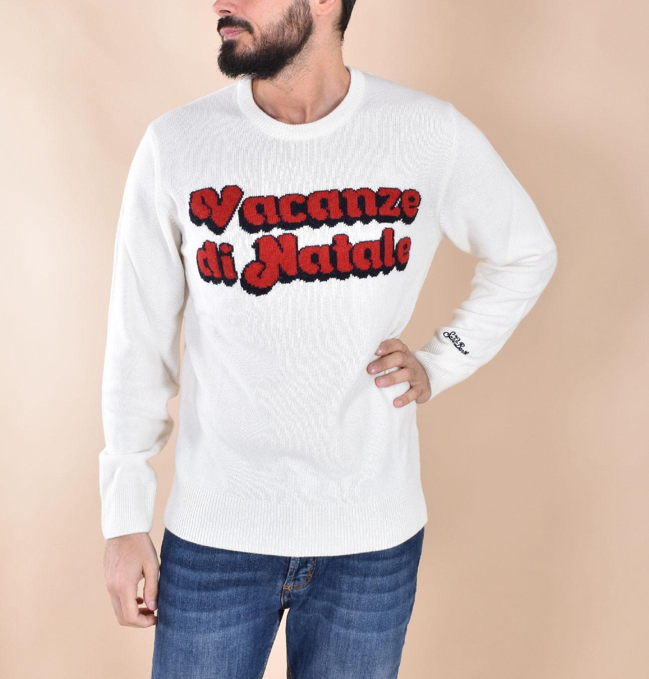 Maglia girocollo vestibilità slim, colore bianco con stampa logo Vacanze di Natale. Limited edition. Tessuto morbido e soffice, non provoca pungitura a contatto con la pelle. Composizione 40% lana, 30% viscosa, 20% poliammide, 10% cashmere. Collezione Autunno/Inverno 2026 Il modello in foto è alto 1.80 x 81 kg, veste taglia L