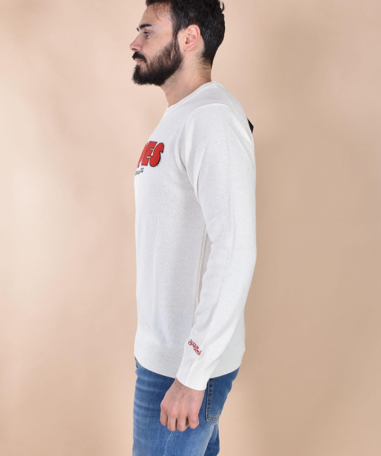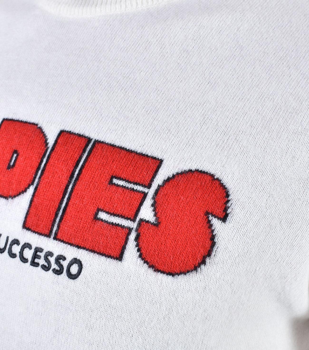 Maglia girocollo vestibilità regolare, colore bianco, stampa Yuppies rossa. Tessuto morbido e soffice, non provoca pungitura a contatto con la pelle. Composizione 45 % lana, 30% viscosa, 15% poliammide, 10% cashmere.