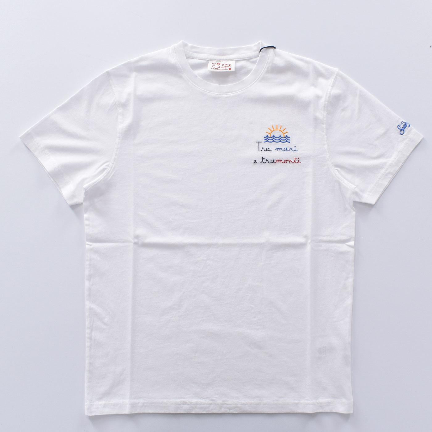T-shirt vestibilità regolare, colore bianco con scritta ricamata mari e tramonti.