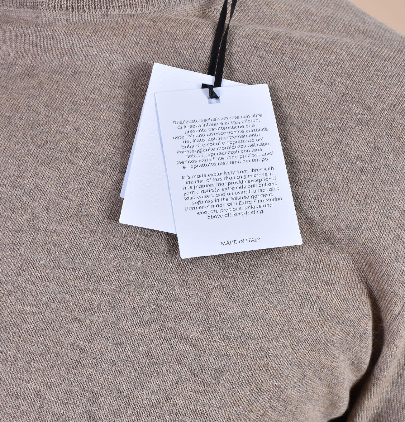 Maglia girocollo in lana merinos extrafine, costruita con fibre di finezza inferiore ai 19,5 micron, colore nocciola. Elastico sul fondo e sui polsini. Tessuto morbido e soffice, non provoca pungitura a contatto con la pelle. Made in Italy. Collezione Autuno/Inverno 2026