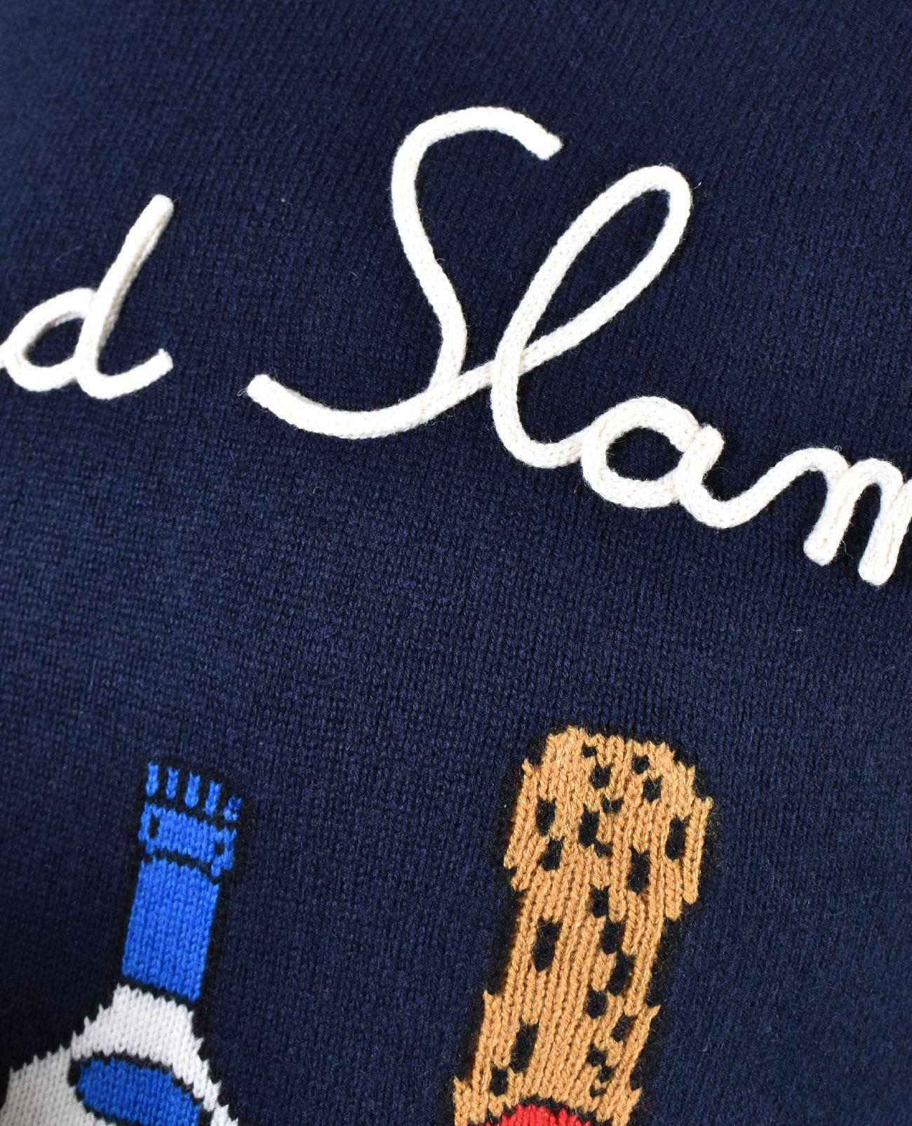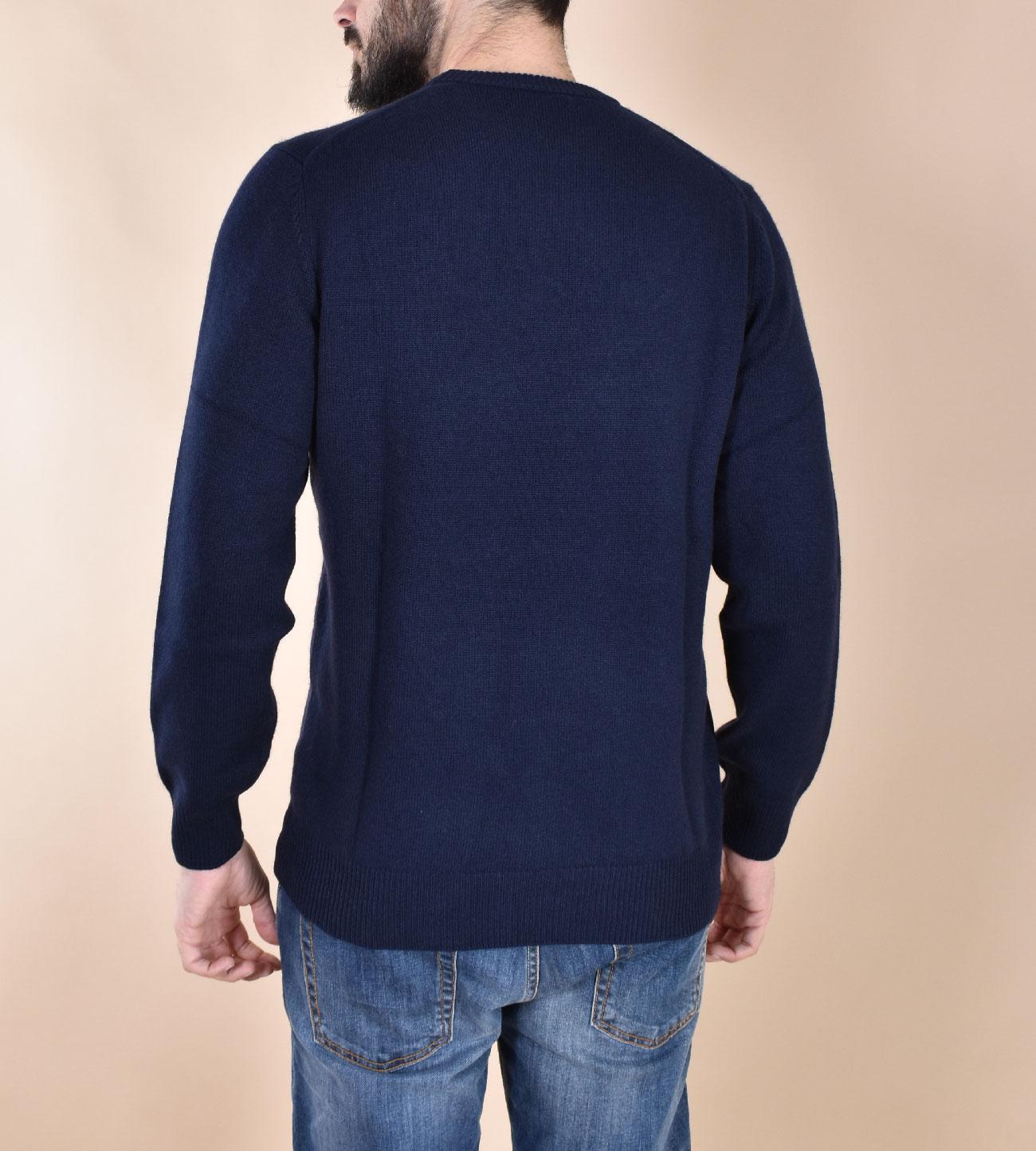 Maglia girocollo vestibilità slim, colore blu con stampa bottiglie e scritta ricamata. Tessuto morbido e soffice, non provoca fastidio a contatto con la pelle. Composizione 40% lana, 25% viscosa, 10% cashmere, 25% poliammidica.