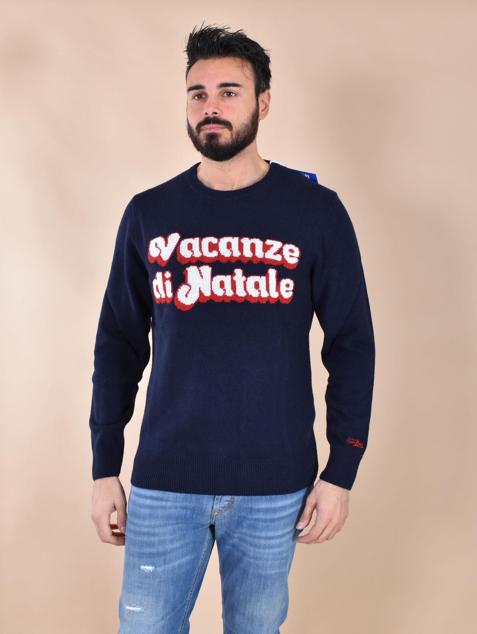 Maglia girocollo vestibilità regolare, colore blu con stampa logo Vacanze di Natale. Tessuto morbido e soffice, non provoca pungitura a contatto con la pelle. Composizione 40 % lana, 30% viscosa, 20% poliammide, 10% cashmere.
