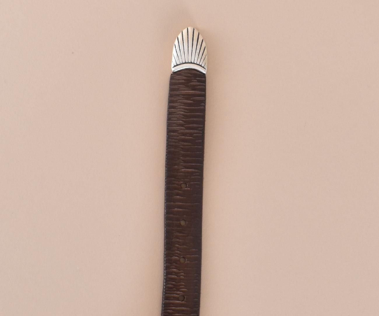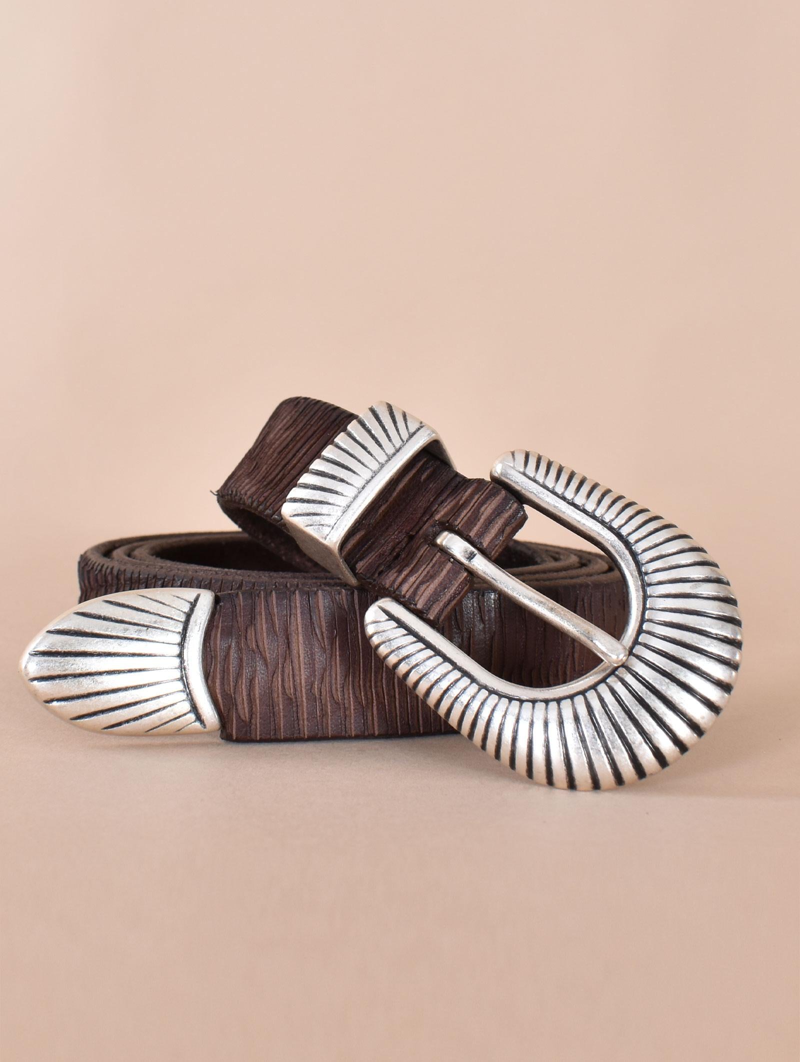 Cintura in pelle con rifiniture a laser sottile, fibbia e fondo punta in nichel. Colore testa di moro. Larghezza 2,5 cm. Made in Italy.