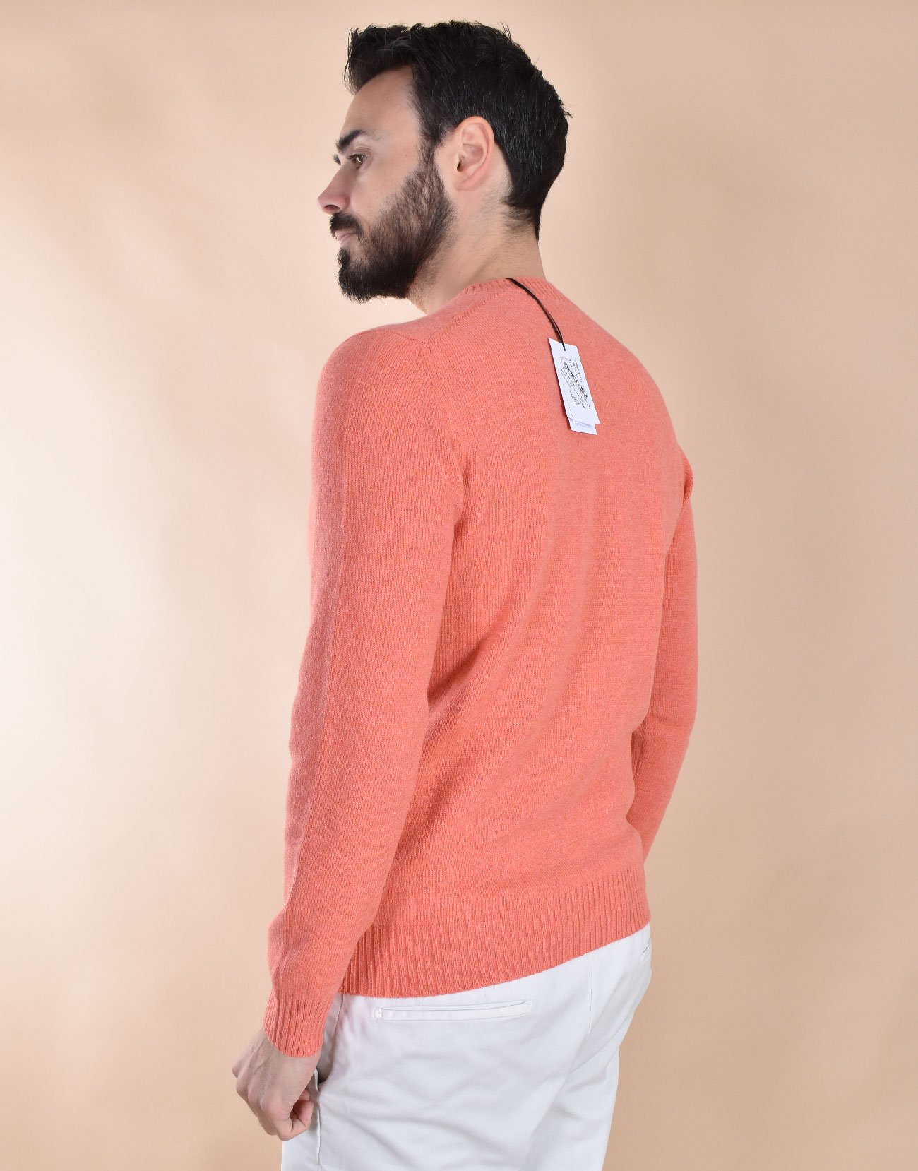Pfirsichfarbener Rundhalspullover in normaler Passform. Gefertigt aus Super Geelong-Strickwolle mit einer welligeren Faserstruktur als herk?mmliche Merinowolle, wodurch der Pullover weicher und angenehmer zu tragen ist. 100 % Schurwolle. Weich und flauschig, kratzt nicht auf der Haut. Hergestellt in Italien.