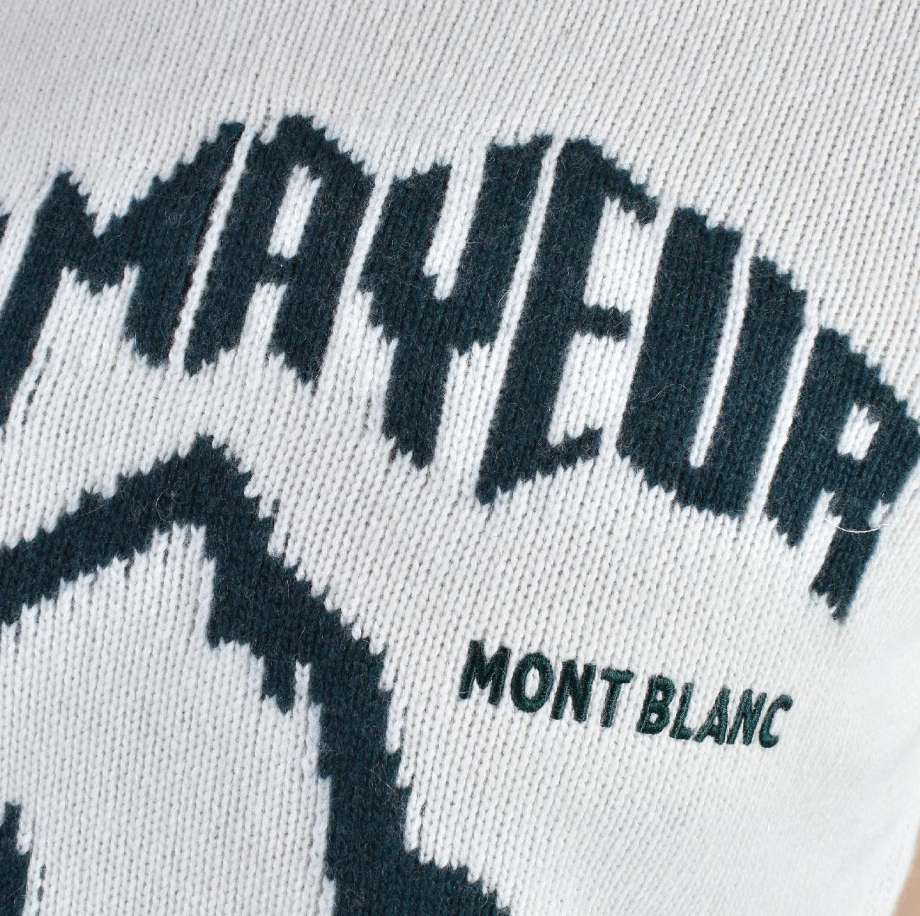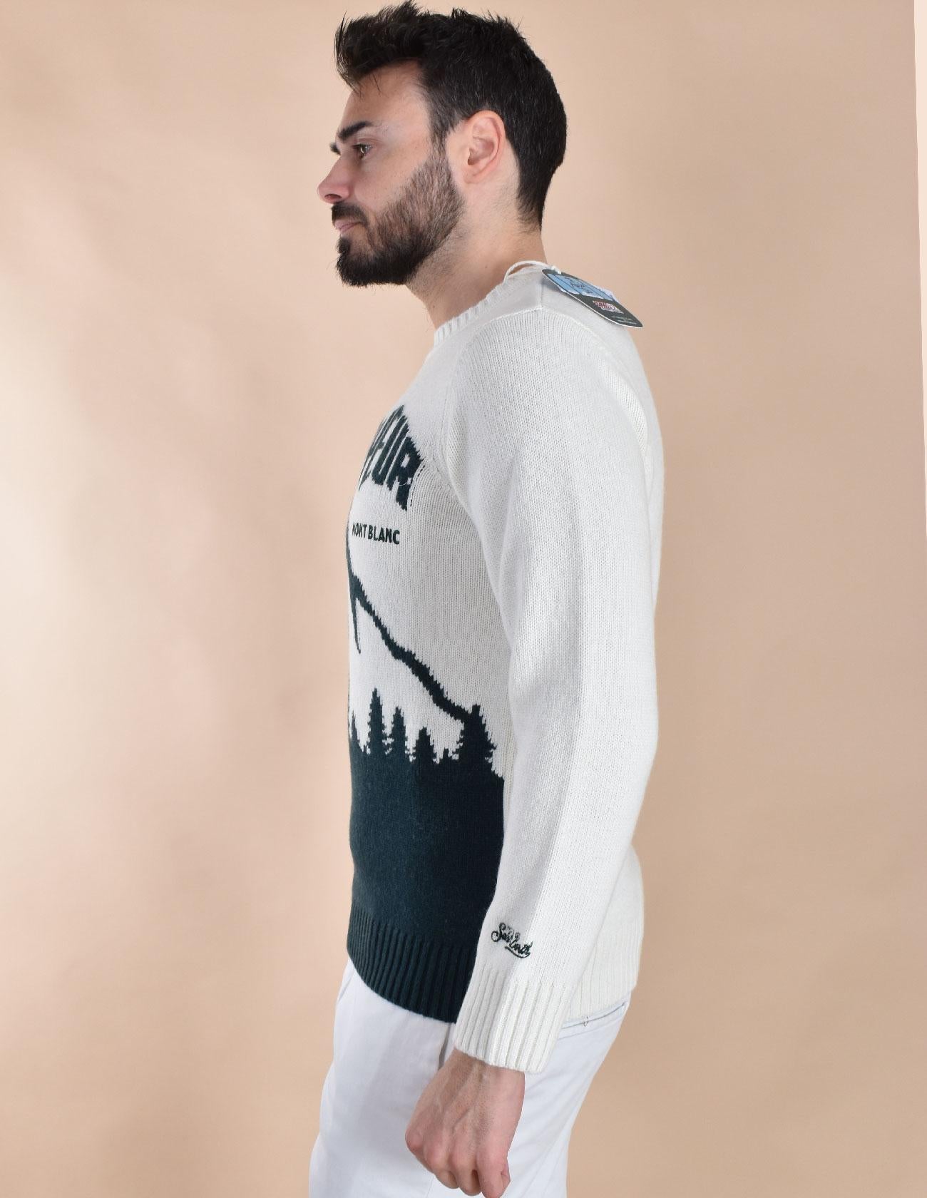 Maglia girocollo vestibilità slim, colore bianco con stampa montagne Courmayeur . Tessuto morbido e soffice, non provoca pungitura a contatto con la pelle. Composizione 45% lana, 30% viscosa, 15% poliammide, 10% cashmere. Collezione Autunno/Inverno 2026 Il modello in foto è alto 1.80 x 81 kg, veste taglia L