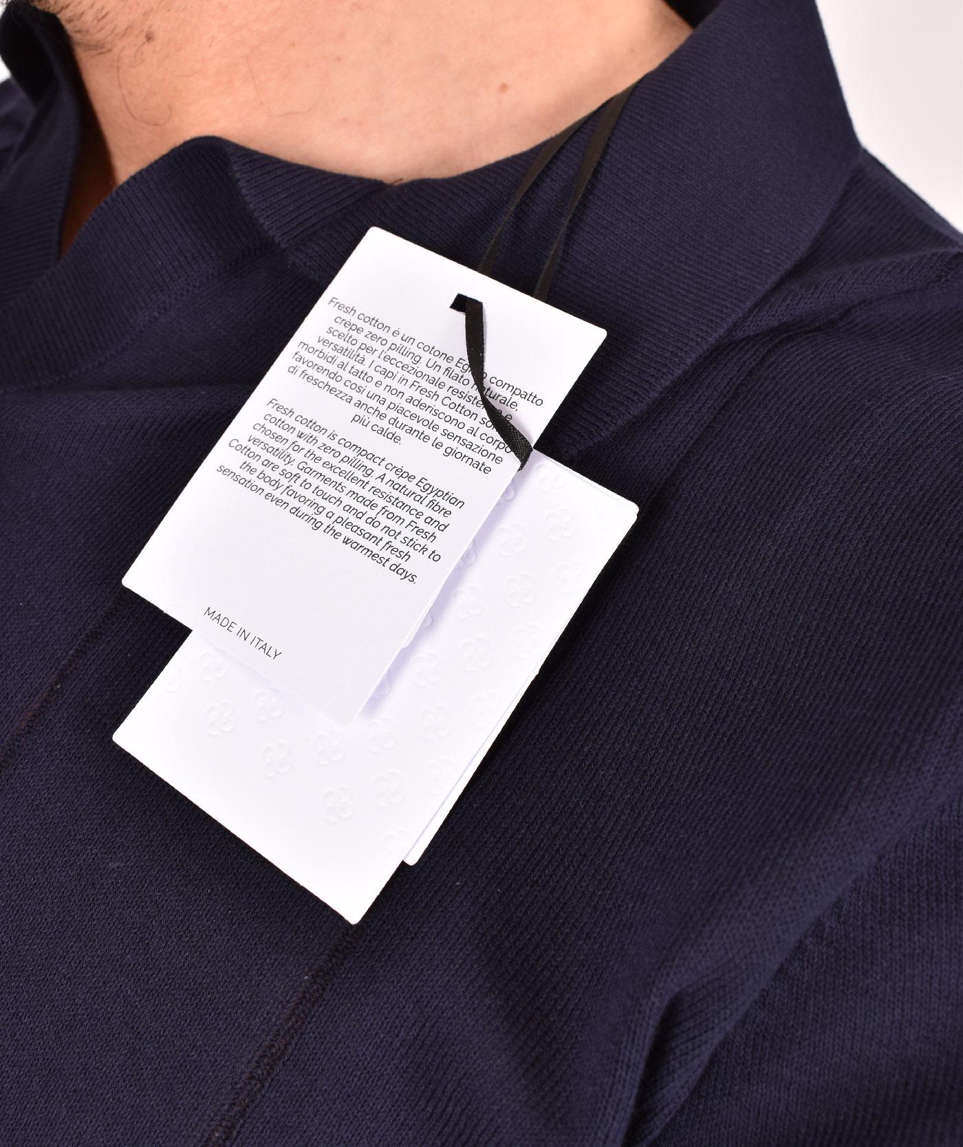 Polo in tessuto a maglia lavorazione fresh cotton, cotone Egitto compatto crèpe zero pilling, morbide e fresche al tatto vestibilità slim. Colore blu notte con lavorazioni a righe verticali. Colletto a V. Composizione 100% cotone. Made in Italy. Collezione Primavera/Estate 2026