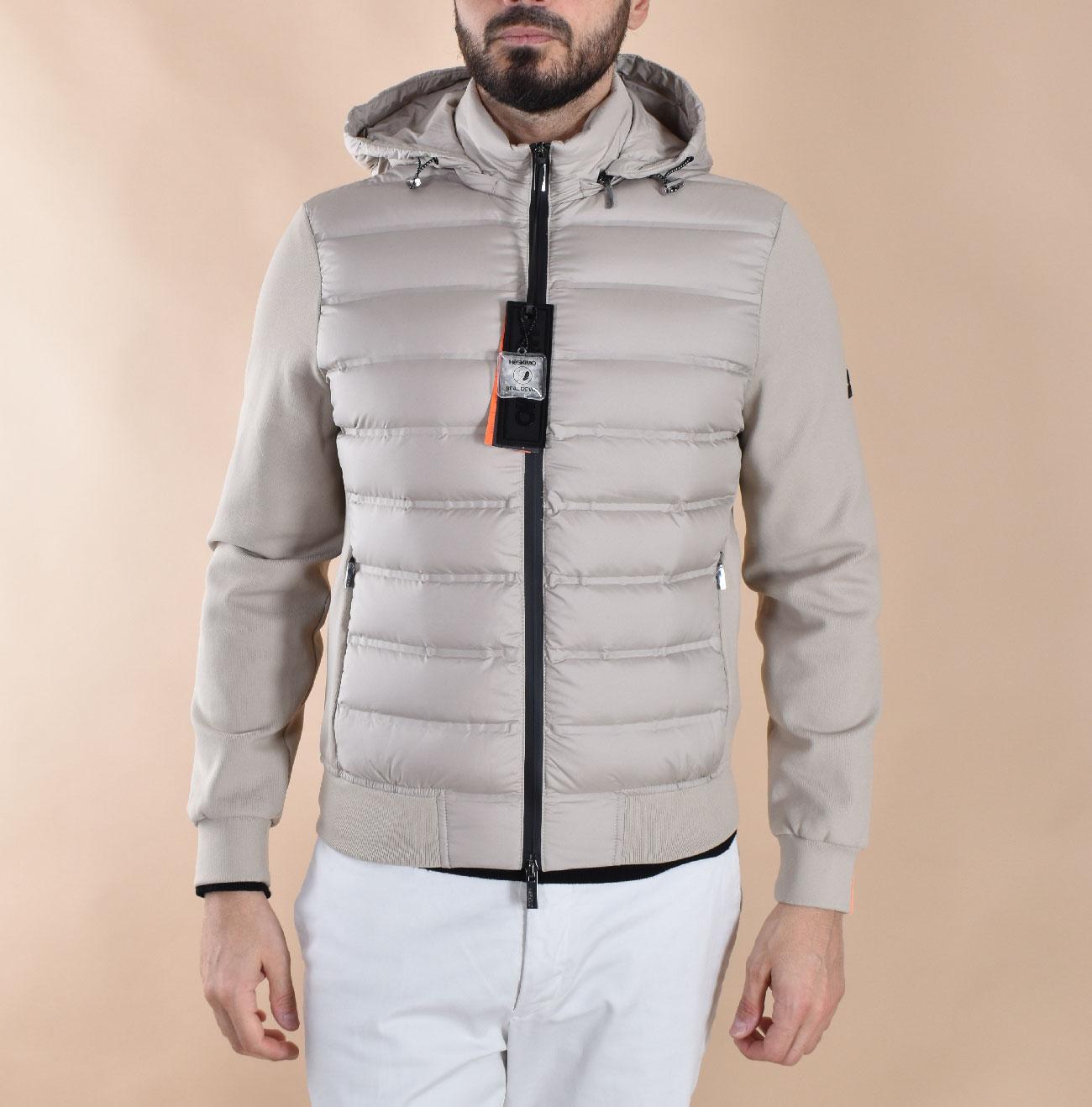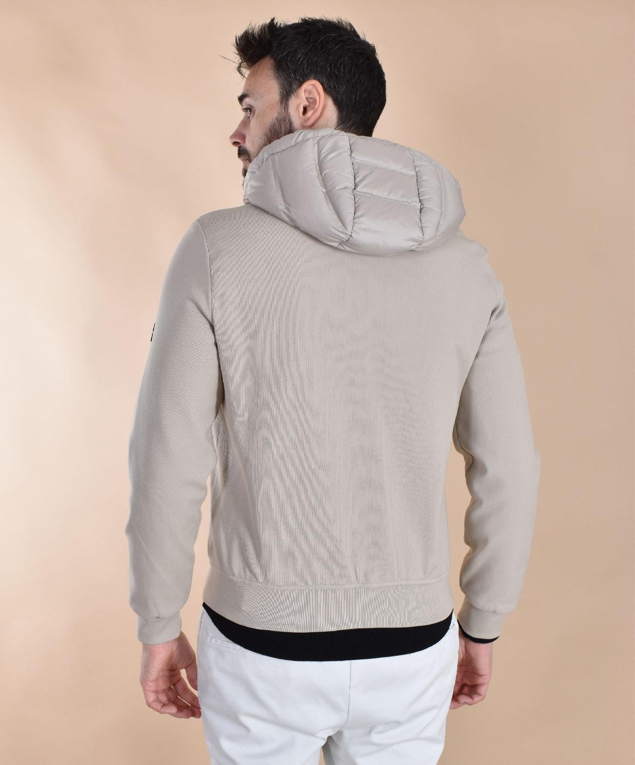 Padded jacket on the torso, contrasting fabric on the sleeves. Beige. Slim fit. Filling: 90% duck down, 10% feathers.