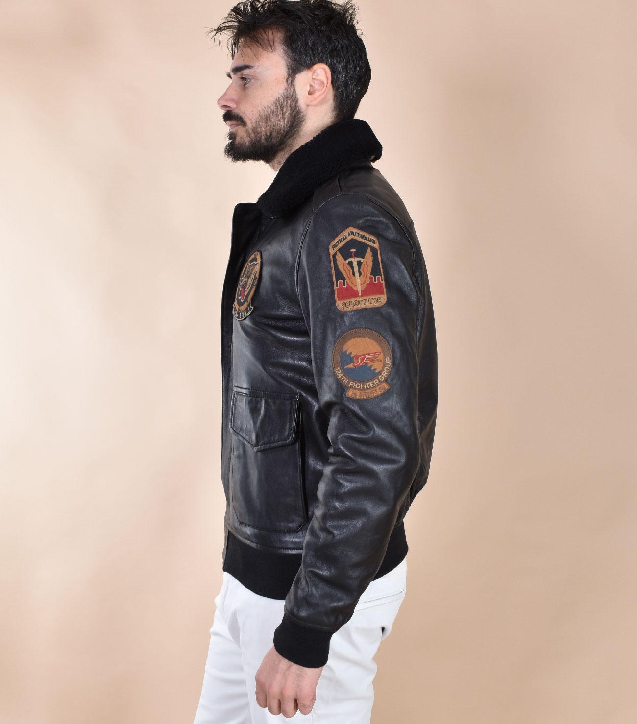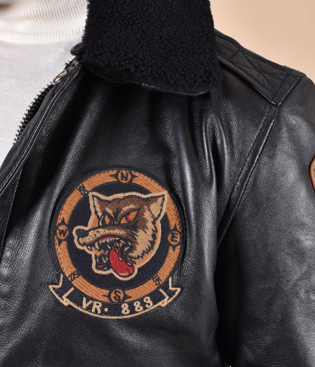 Black genuine leather aviator bomber jacket with fur collar. Rangers patches.
