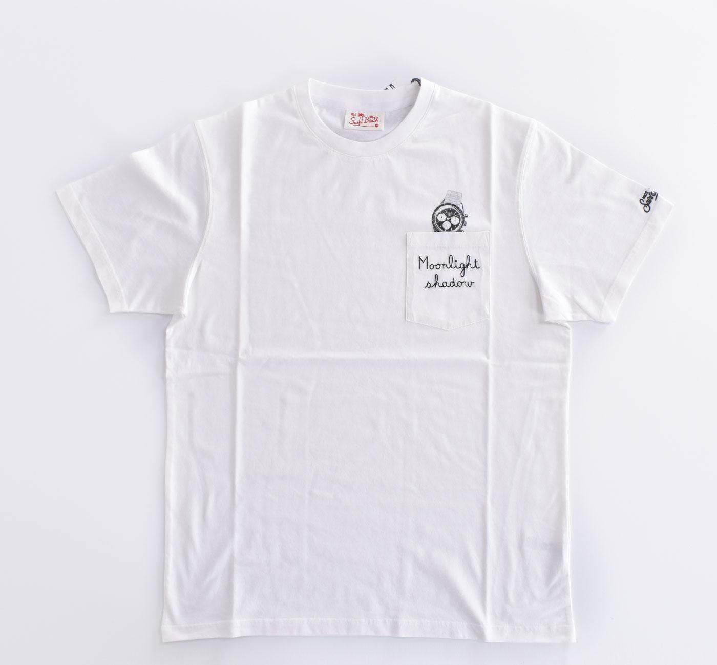 Regular-fit white T-shirt with a printed watch pocket and embroidered "Moonlight Shadow" lettering. 100% cotton.
