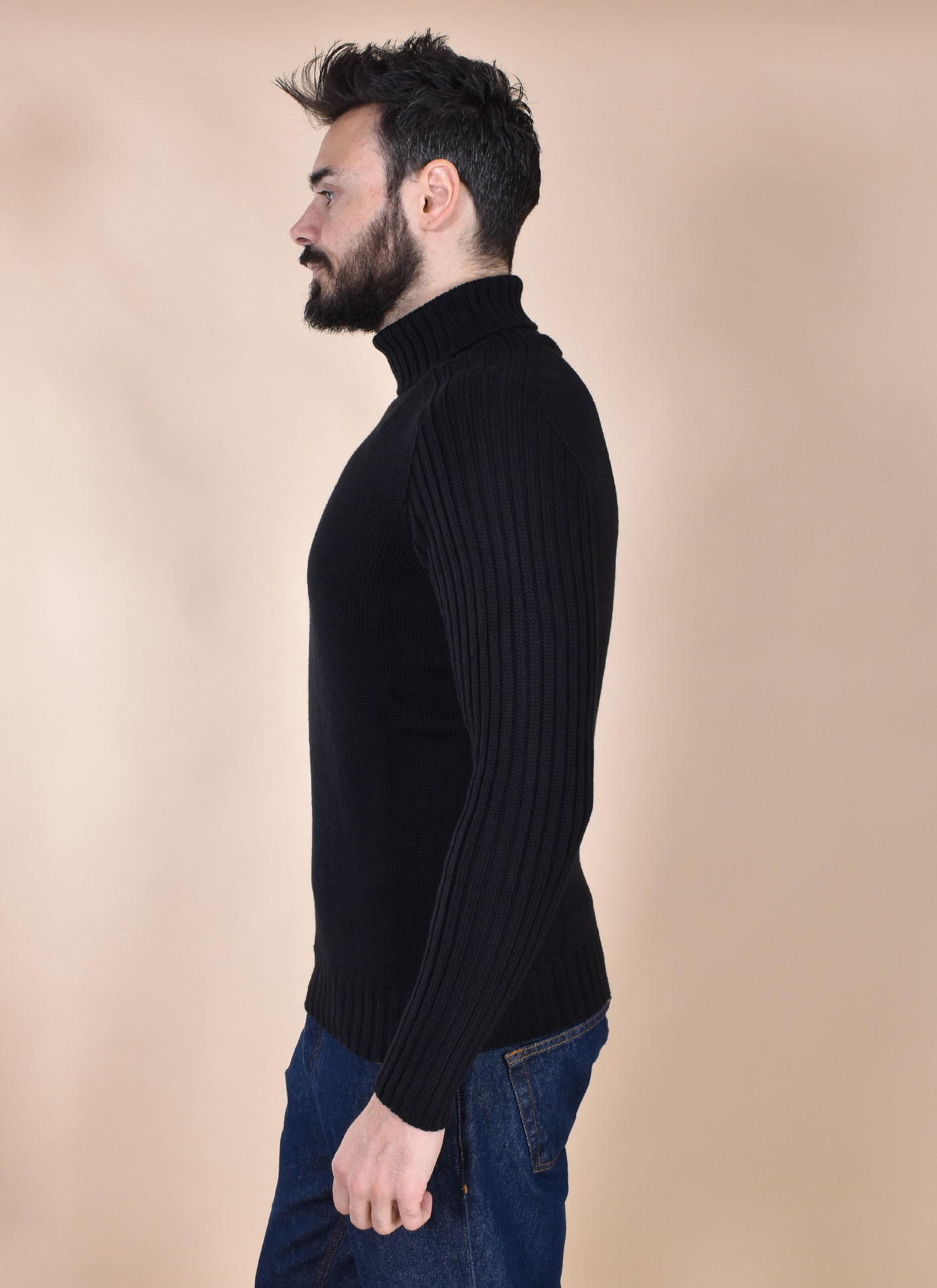 Turtleneck sweater in Rain Wool virgin wool, water-repellent TEFLON treatment. Black, slim fit. Soft and cozy fabric, does not itch when in contact with the skin. Made in Italy.