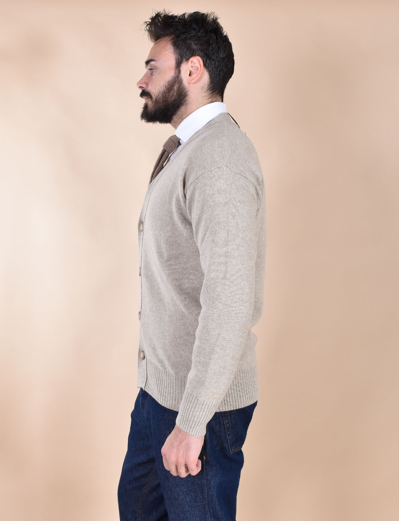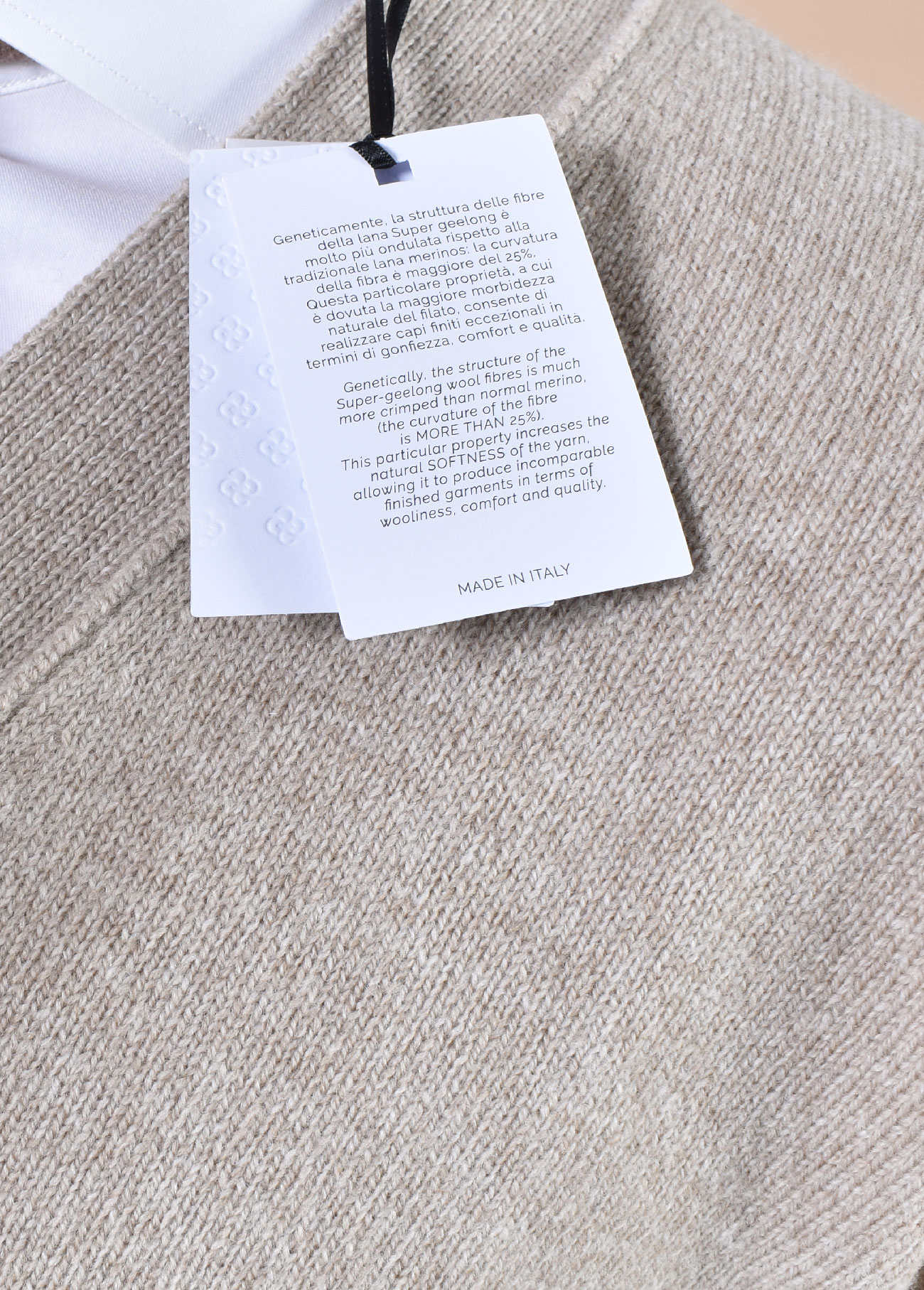 Regular-fit beige cardigan, Super Geelong construction with wavier fiber structures than traditional merino wool, making the garment softer and more comfortable. 100% virgin wool. Soft and fluffy, it doesn't itch when in contact with the skin. Made in Italy.