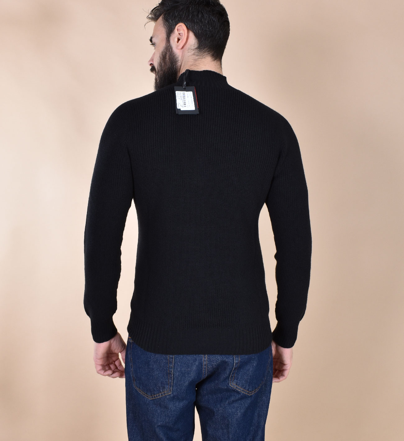 Mock neck sweater, 100% virgin Rain Wool, water-repellent TEFLON treatment. Black, slim fit. Soft and supple fabric, non-stinging. Made in Italy.