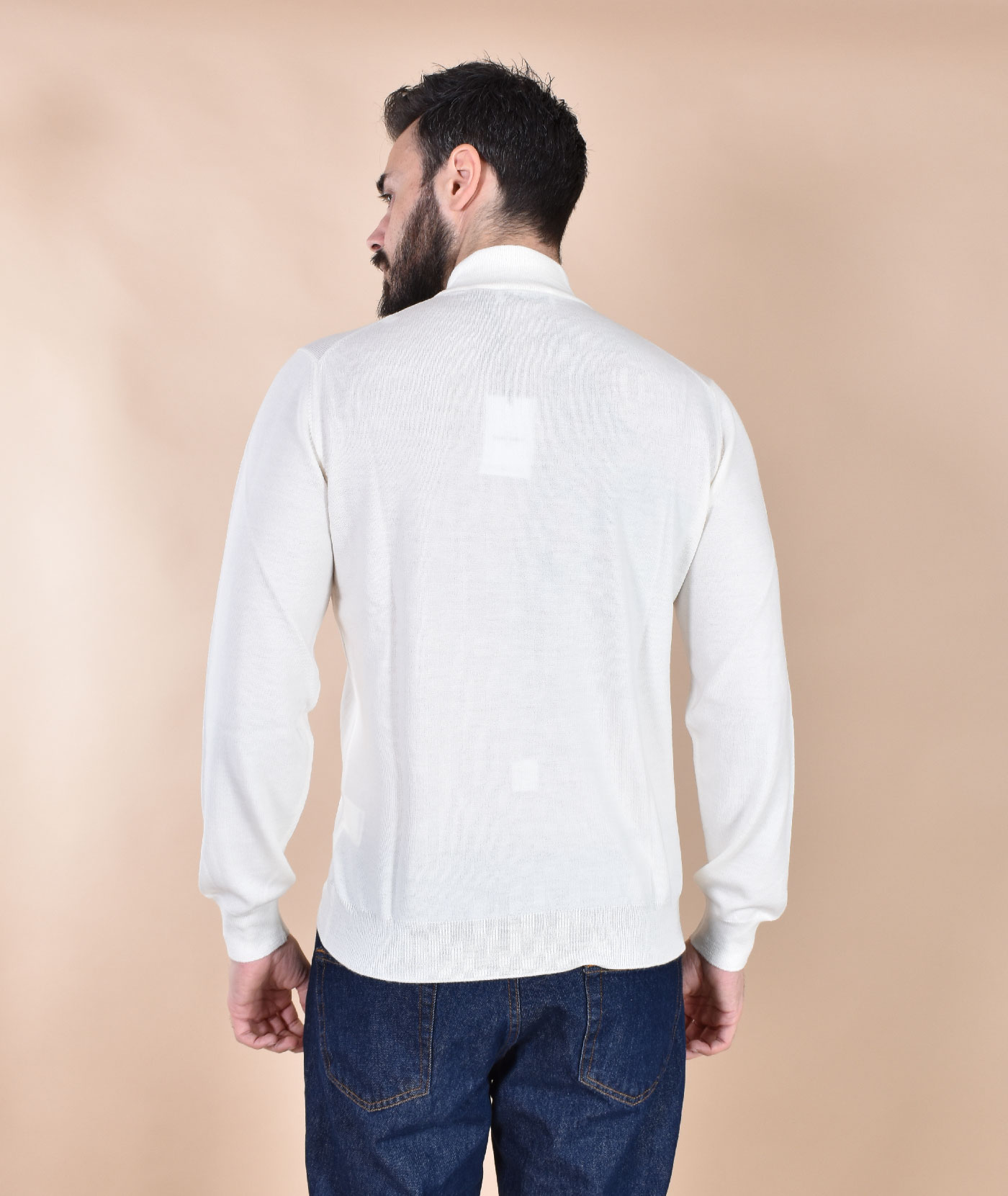 Mock-neck sweater, white and cream, made from extra-fine merino wool, crafted with fibers less than 19.5 microns fine. Soft and supple, it doesn't prick the skin. Made in Italy.