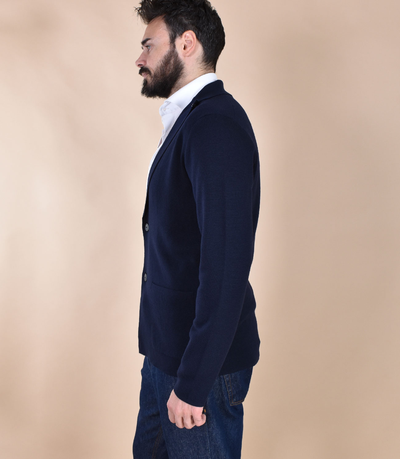 Navy blue fine-knit jacket in 100% extra-fine merino wool, slim fit. Two-button closure, patch pockets. Soft and supple fabric that doesn't itch when in contact with the skin. Made in Italy.