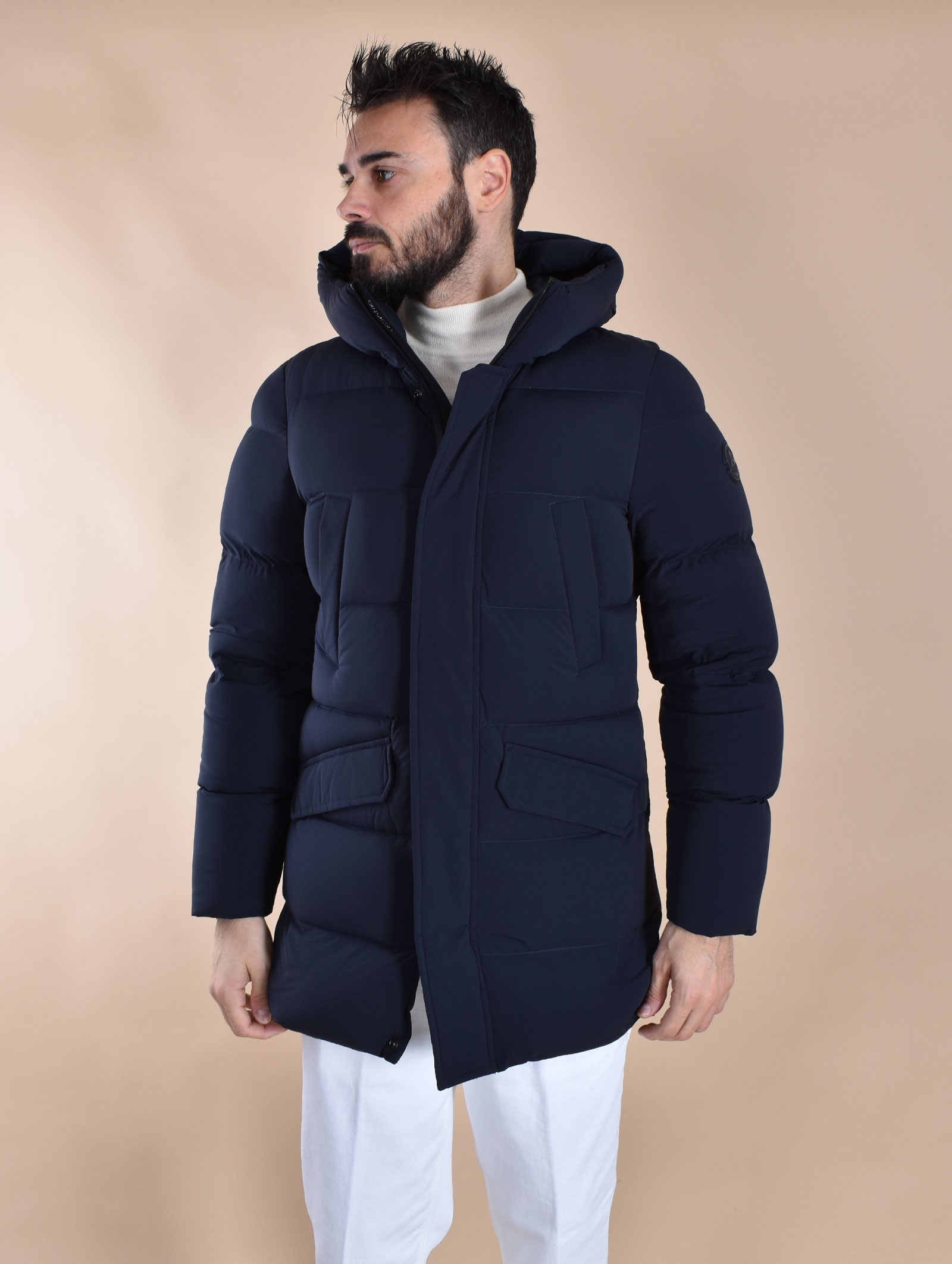 Long parka-style down jacket filled with 90% duck down and 10% feathers, superlight. Midnight blue. Regular fit.