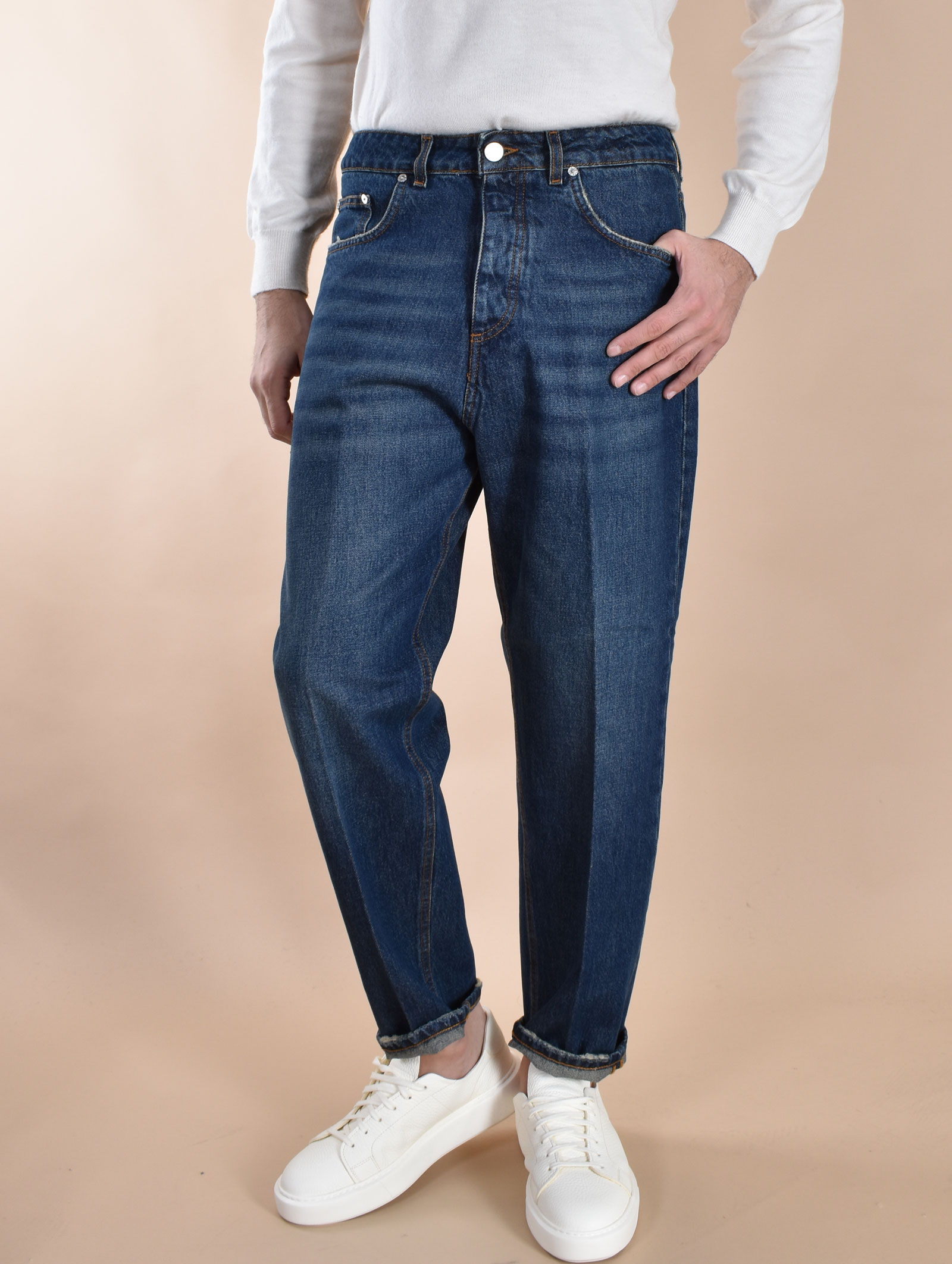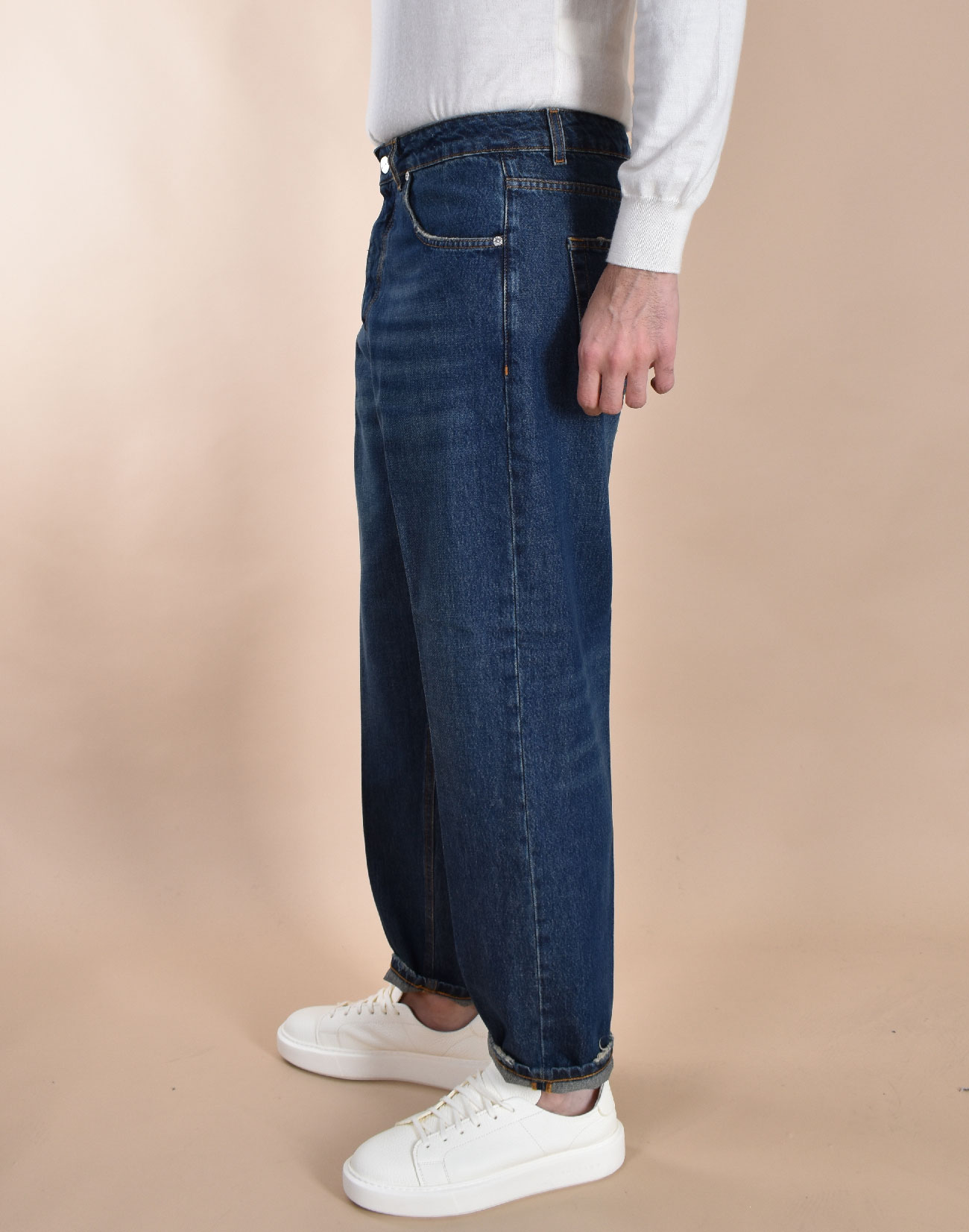 Jean 5 poches, coupe classique et courte, bleu fonc?, avec ceinture ? quatre boutons. 100 % coton. Fabriqu? en Italie.
