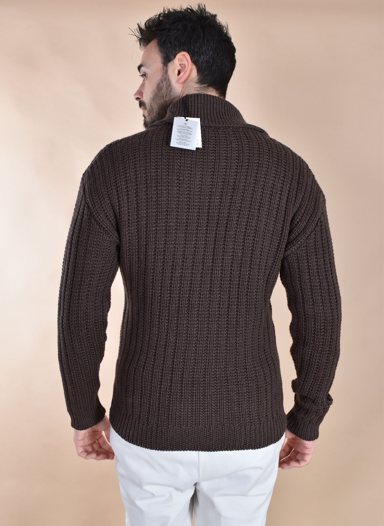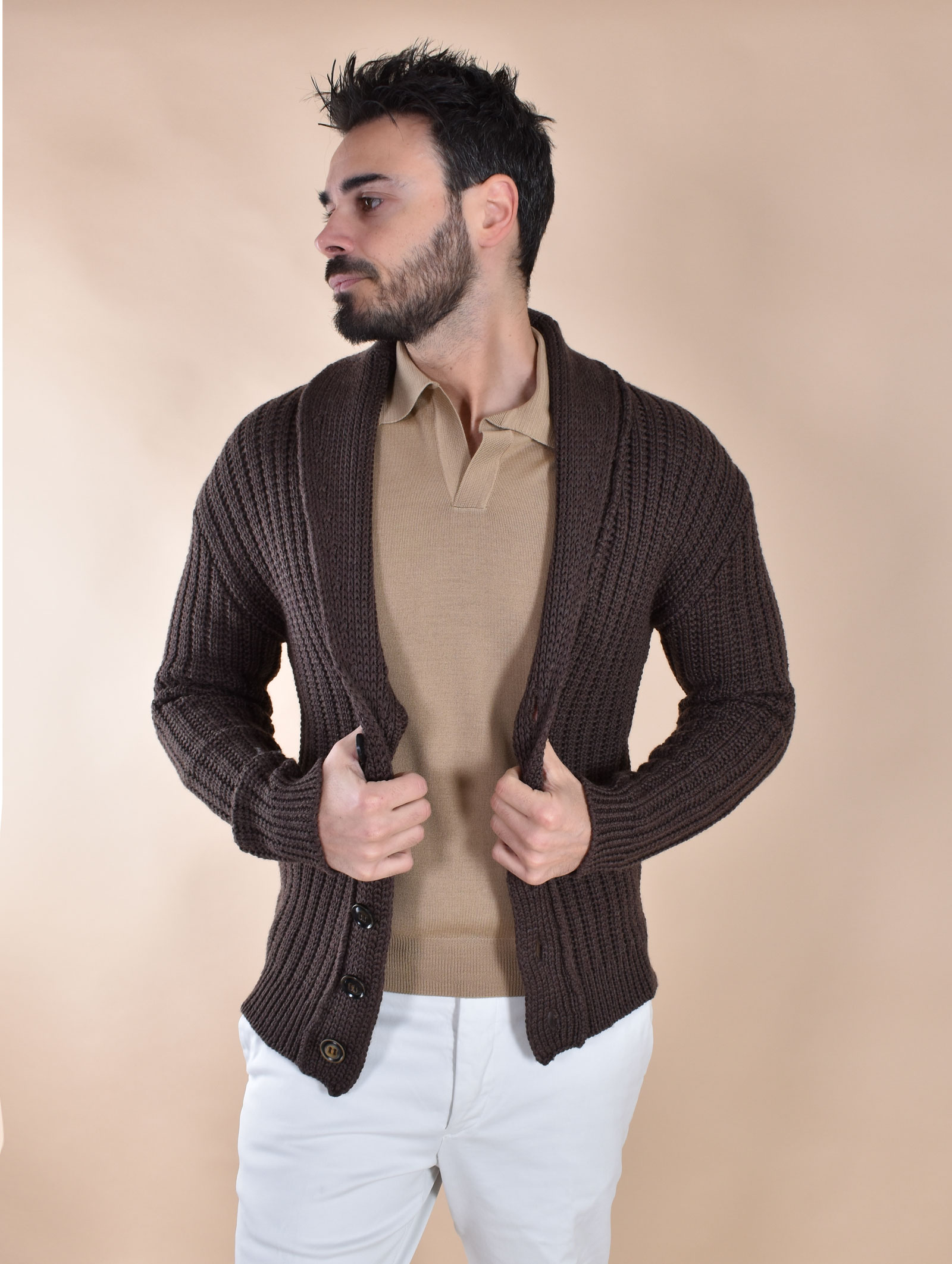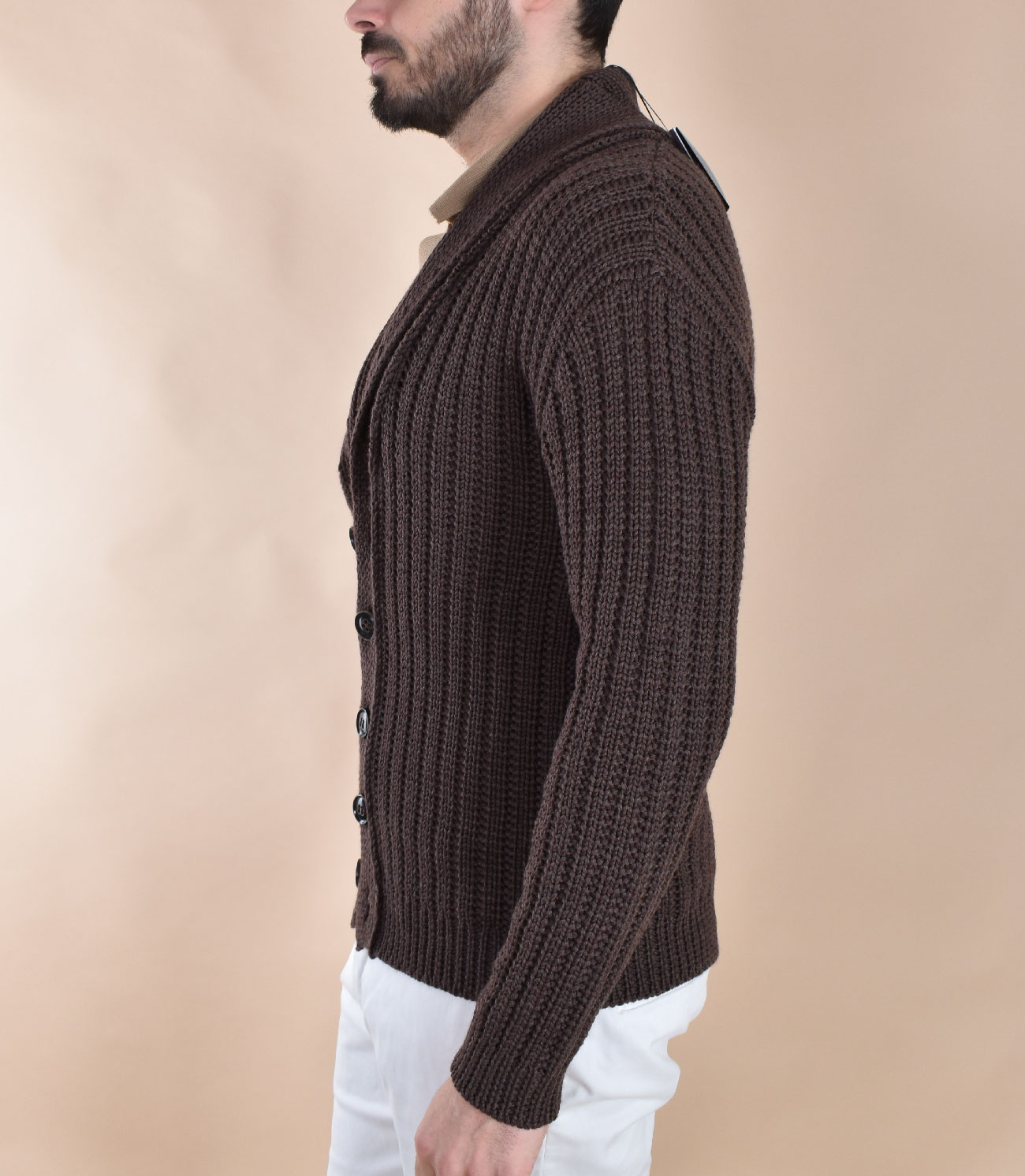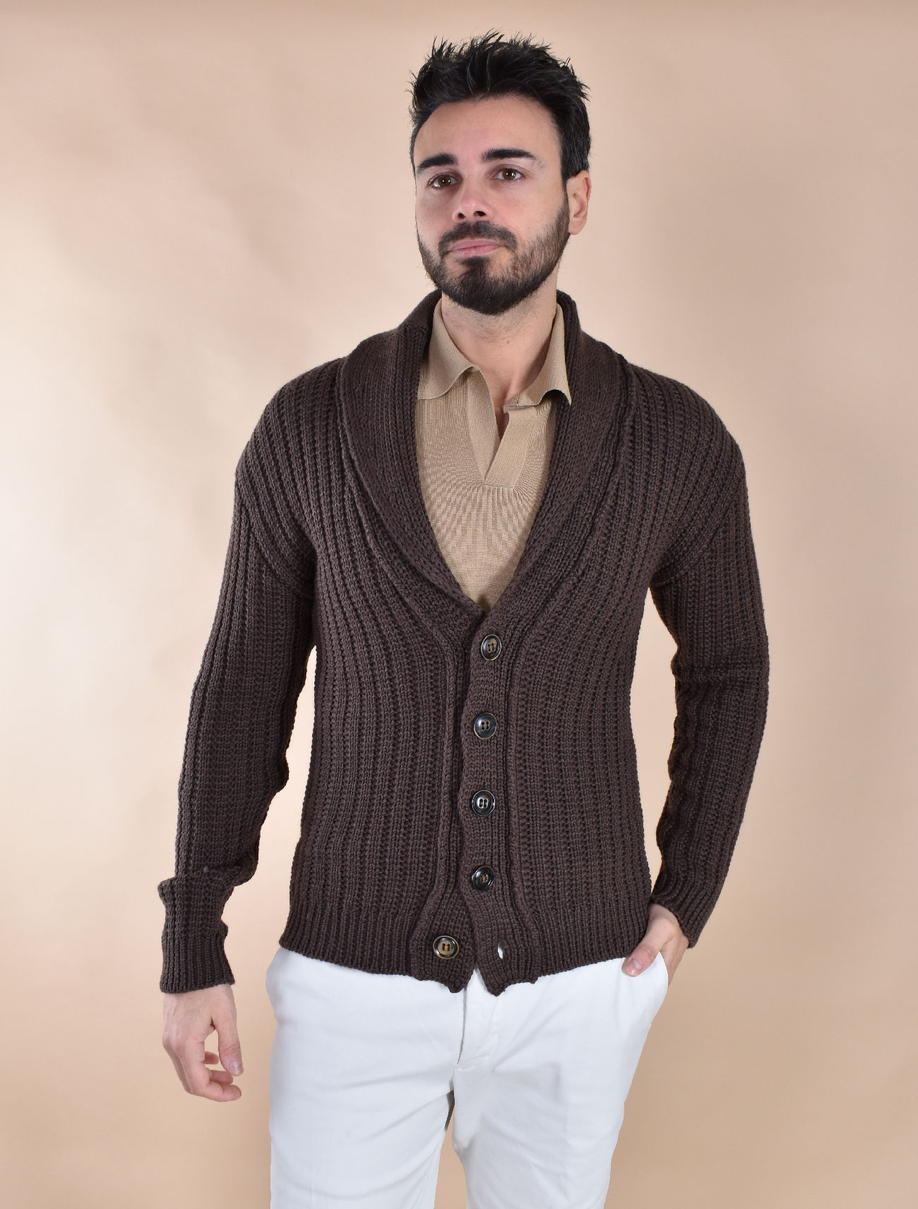 Gilet ?pais ? col ch?le, marron chocolat. Style Steve McQueen (Soldier). Coupe ajust?e. Tissu doux et souple, agr?able au toucher. 100 % laine m?rinos extra-fine. Fabriqu? en Italie.