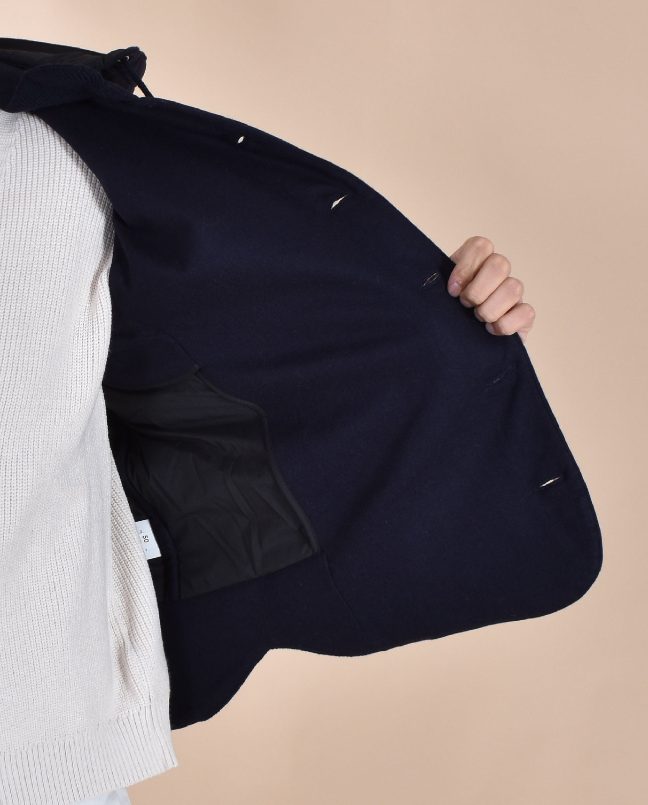Giubbino smanicato in doppio tessuto lana vergine, colore blu scuro, vestibilità slim. Chiusura con bottoni, cappuccio removibile e regolabile con laccio